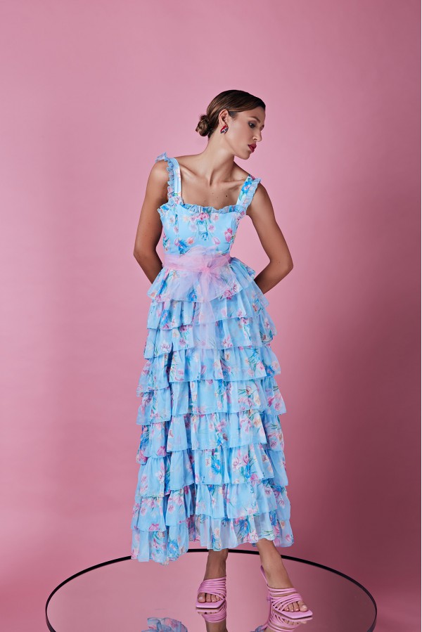 Abito lungo con bretelle bustino stretto e gonna voulant