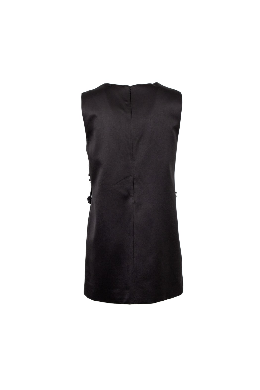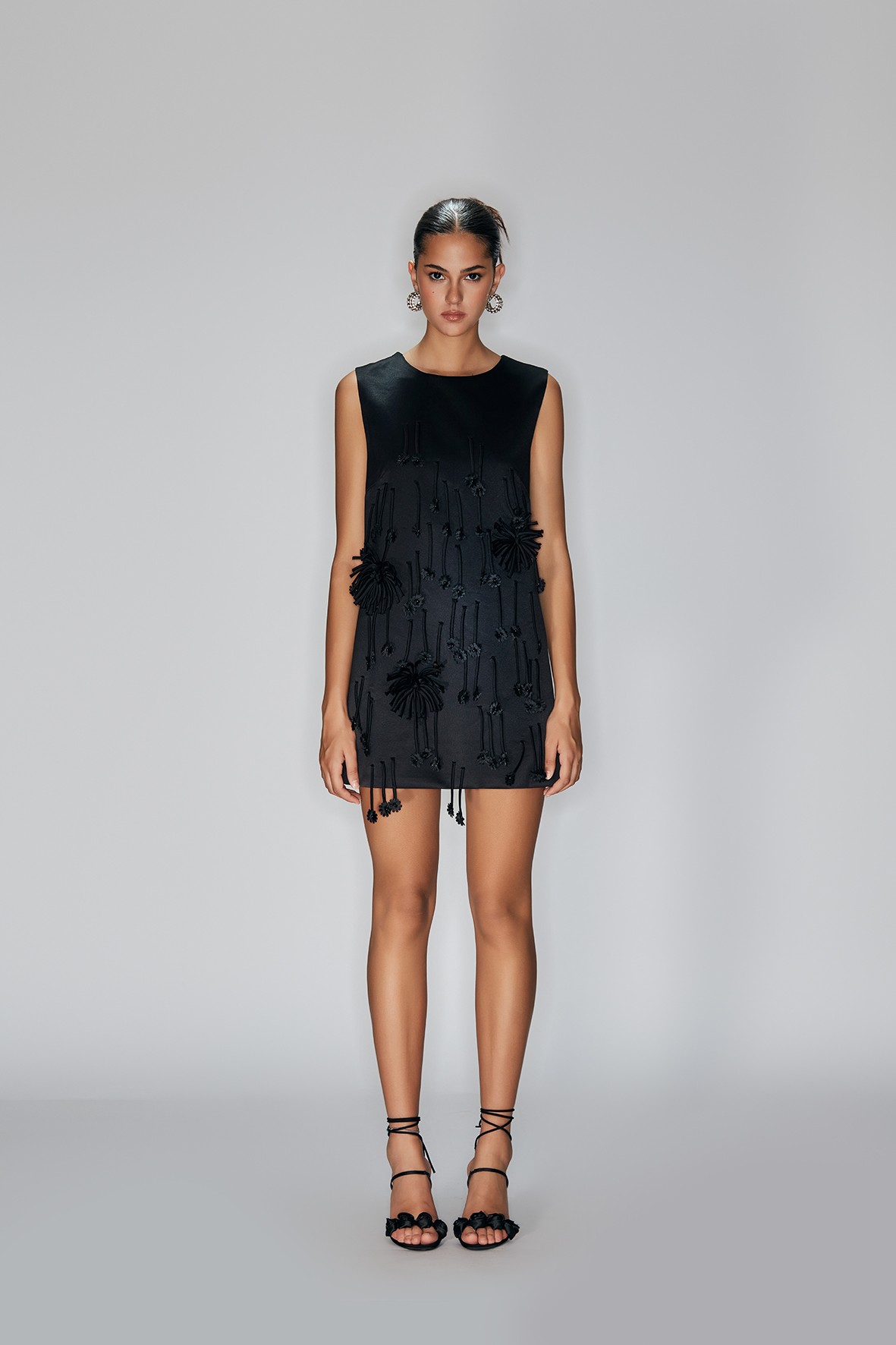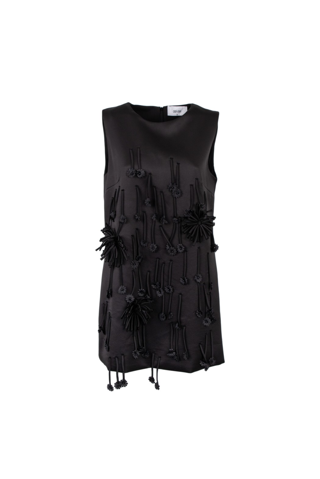 Abito midi con scollo tondo, frange in tessuto, fiorellini e perline..