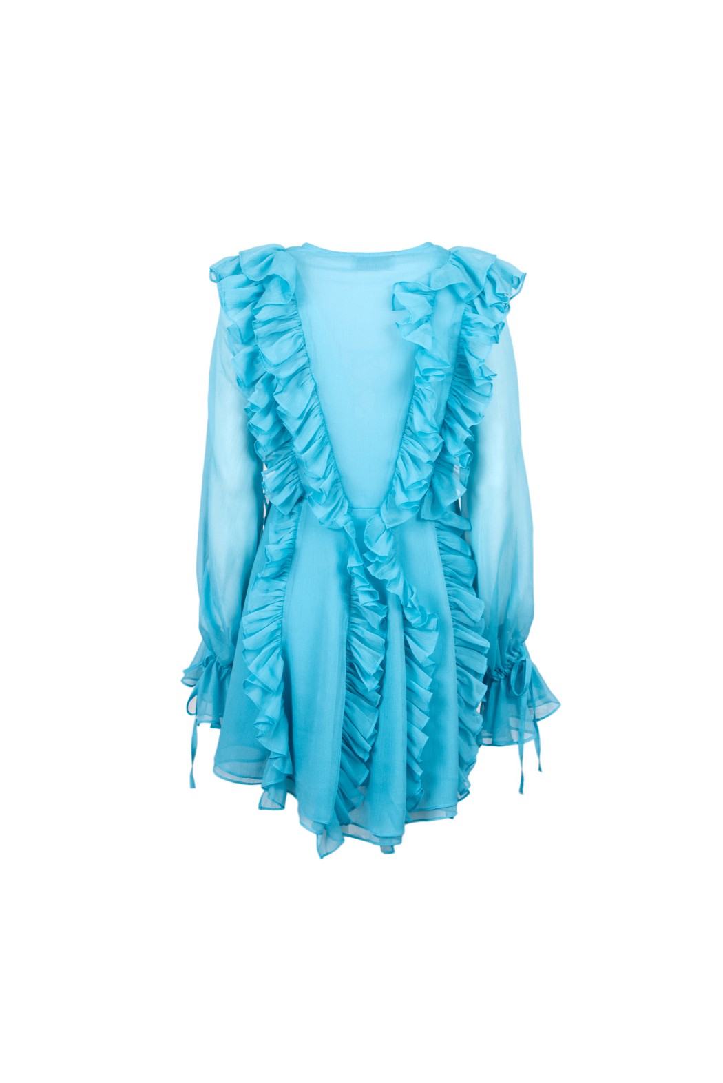 Abito mini scollo profondo, con rouches legato sul fronte e sui polsi.