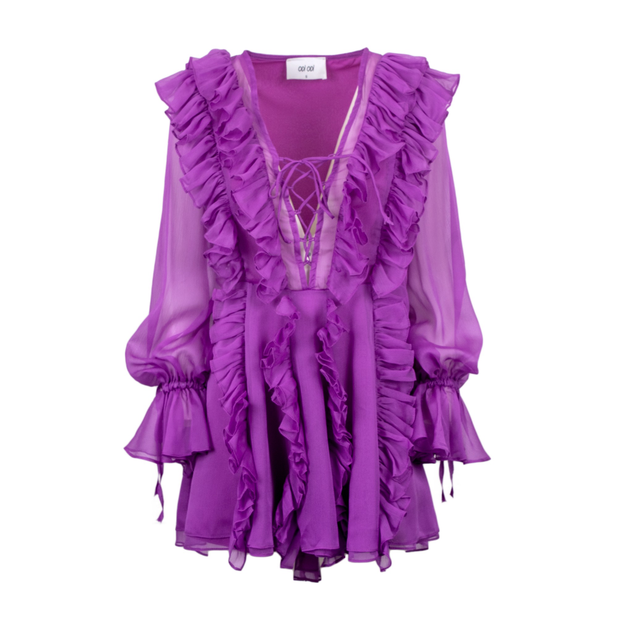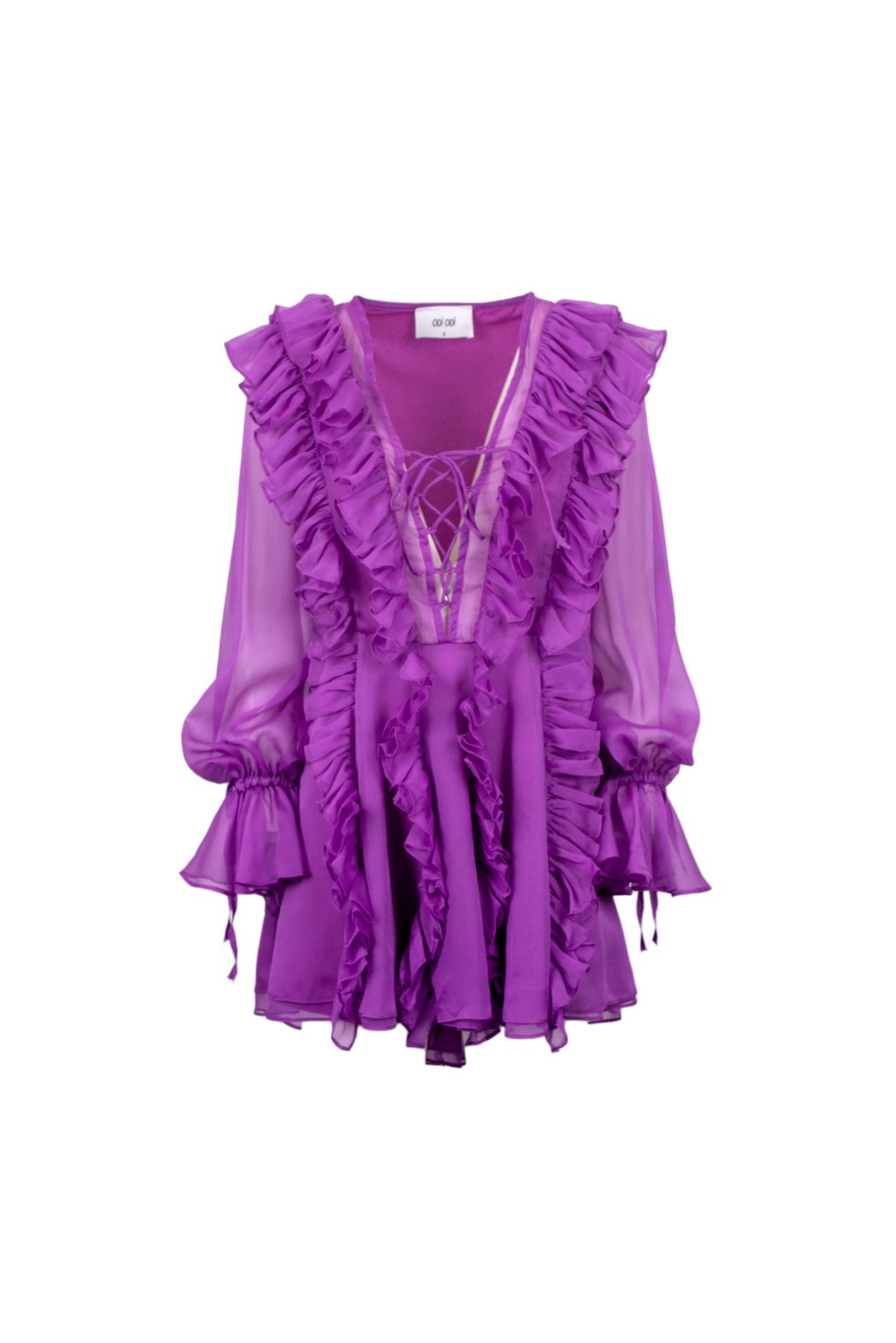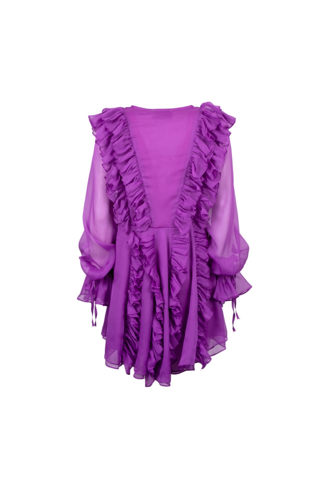 Abito mini scollo profondo, con rouches legato sul fronte e sui polsi.