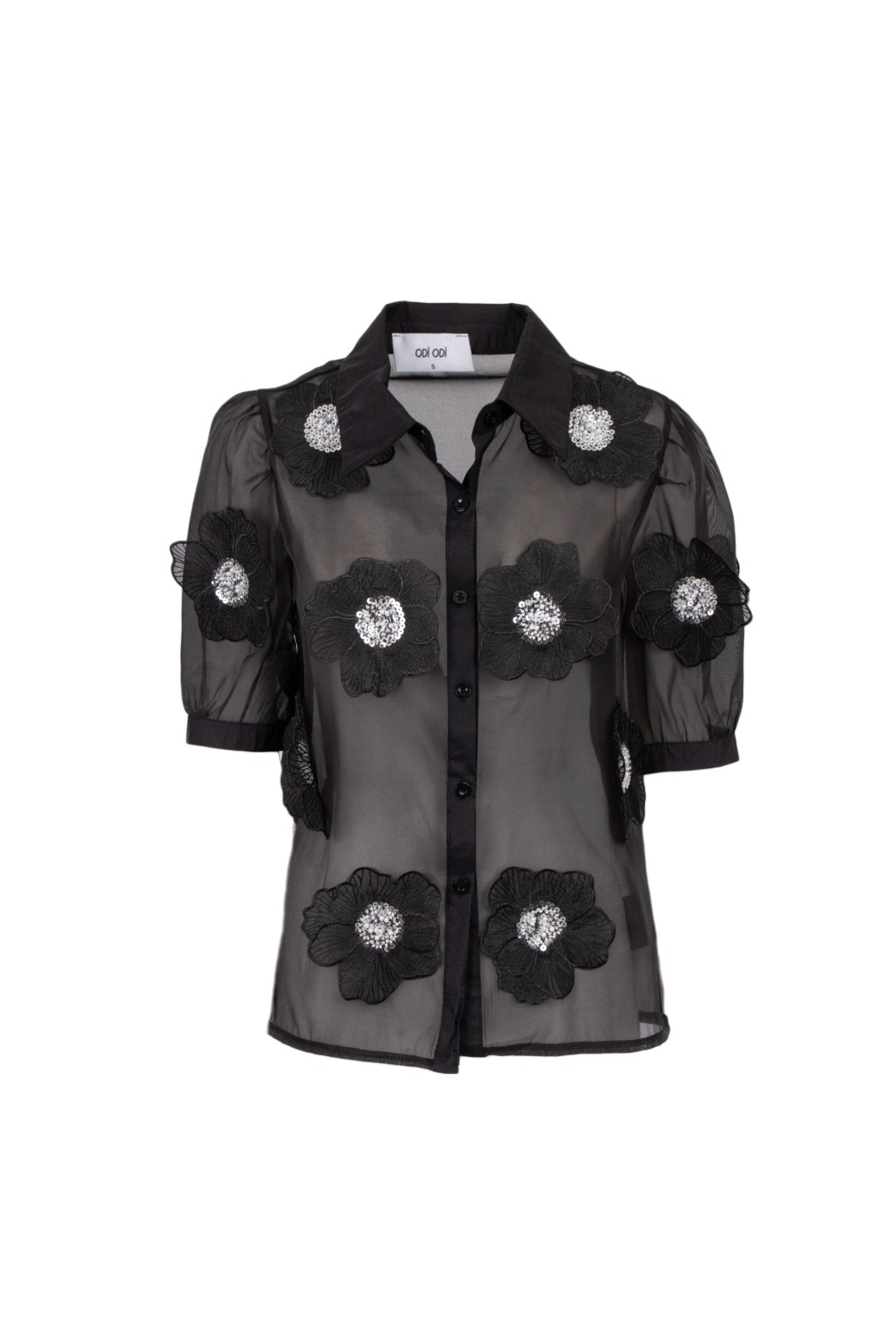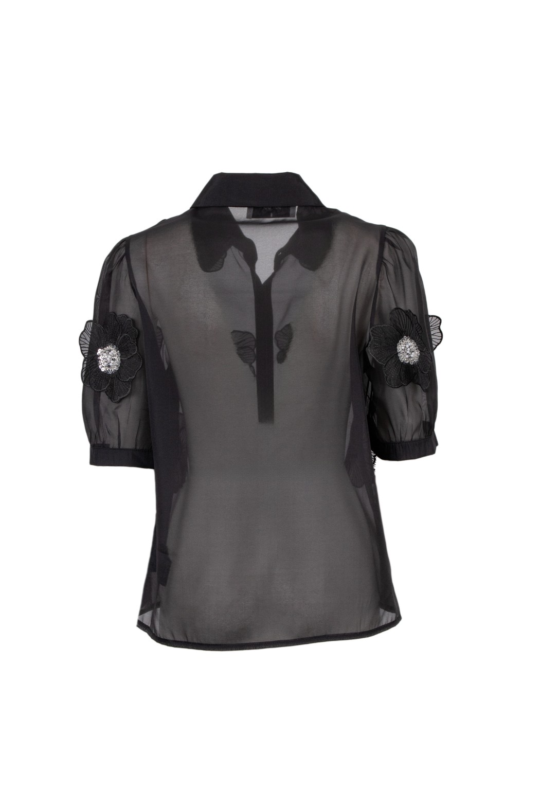 Camicia in tulle colletto classico, con fiori in tessuto e paillettes applicati.