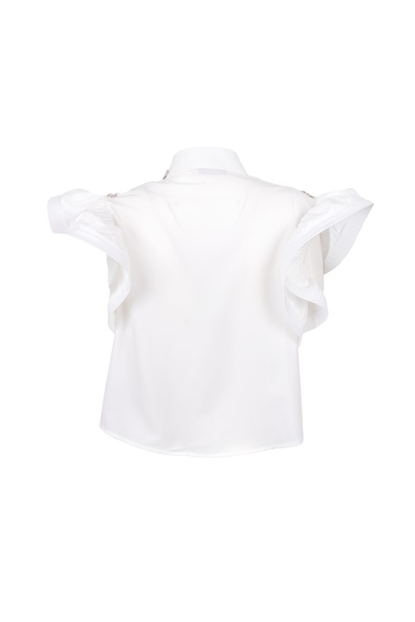 Camicia collo classico, dettagli gioiello, rouches sulle spalle.