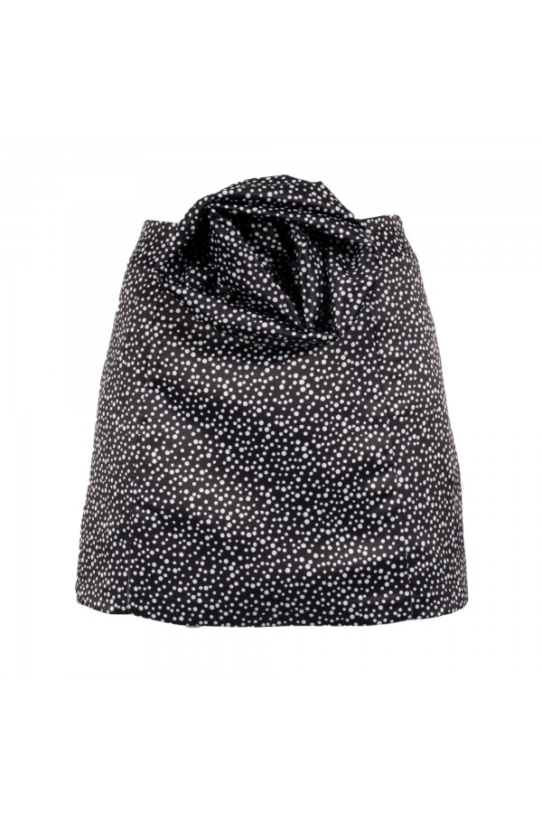 Gonna mini in stampa mini pois, grande fiore in tessuto applicato davanti.