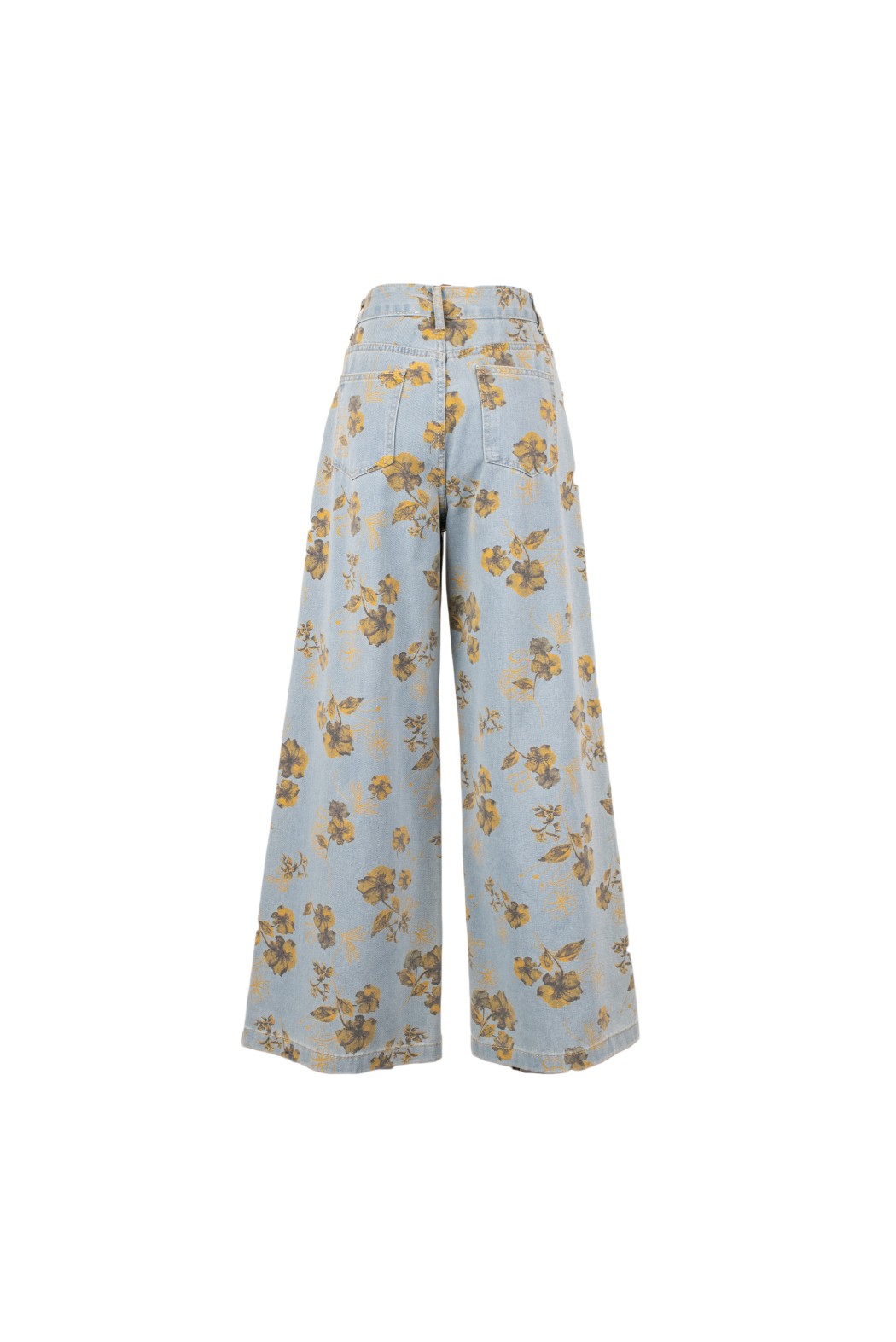 Jeans da donna in denim chiaro con stampa floreale e gamba ampia, perfetti per look femminili, originali e di tendenza dal gusto contemporaneo.
