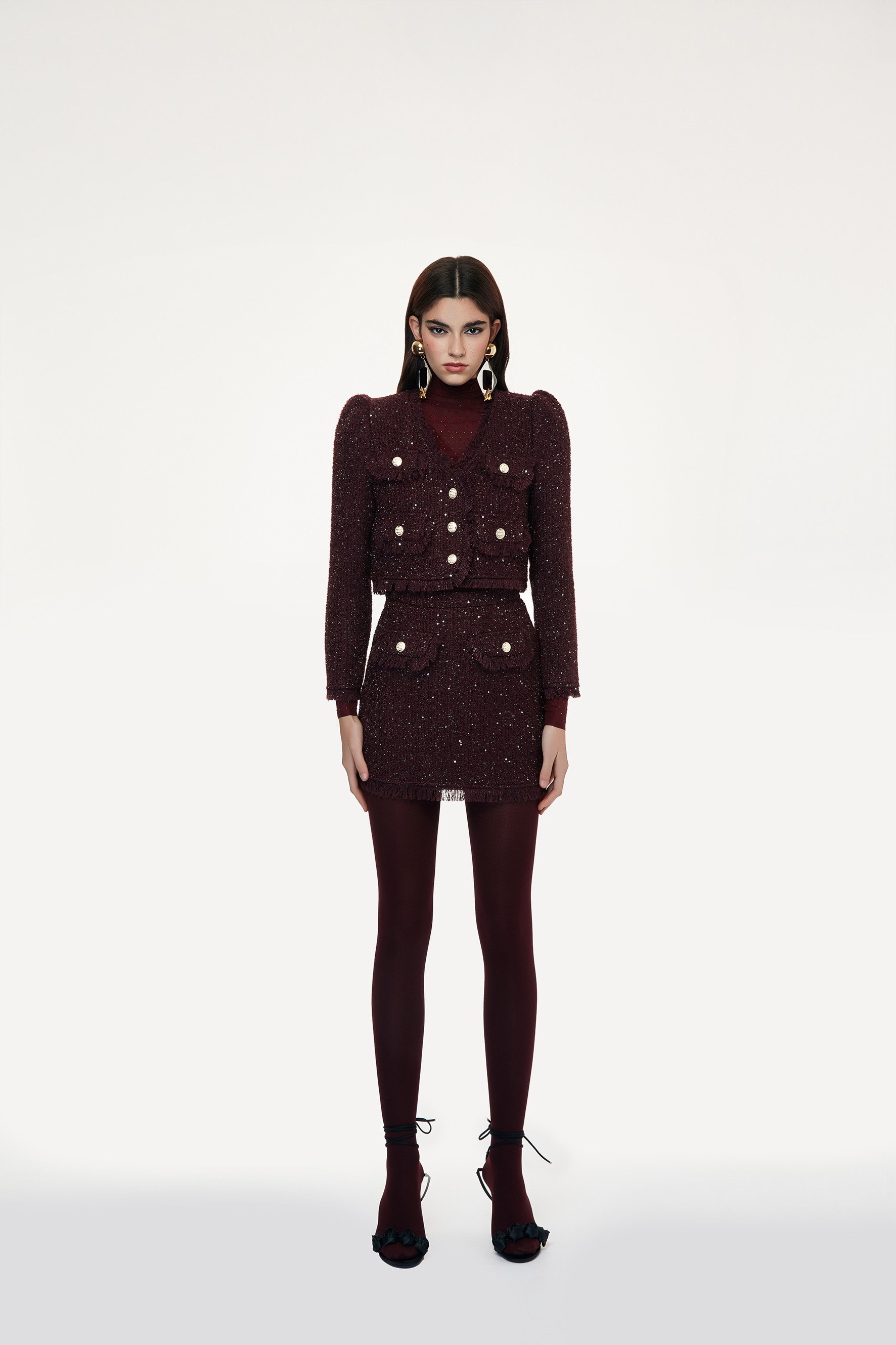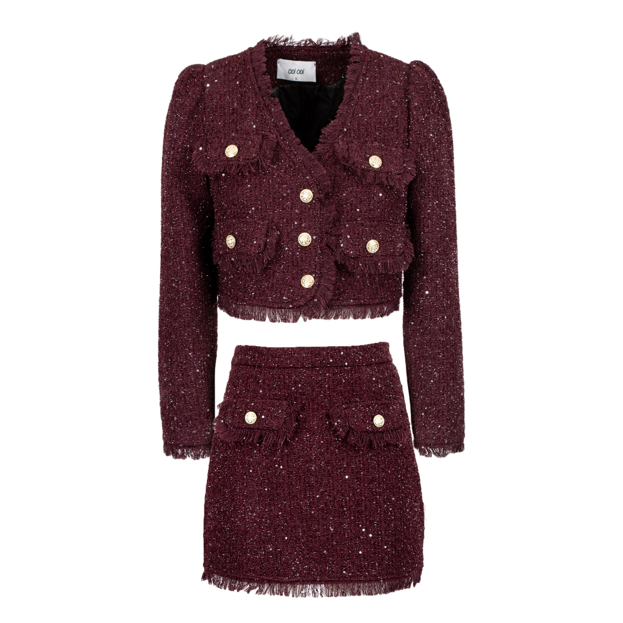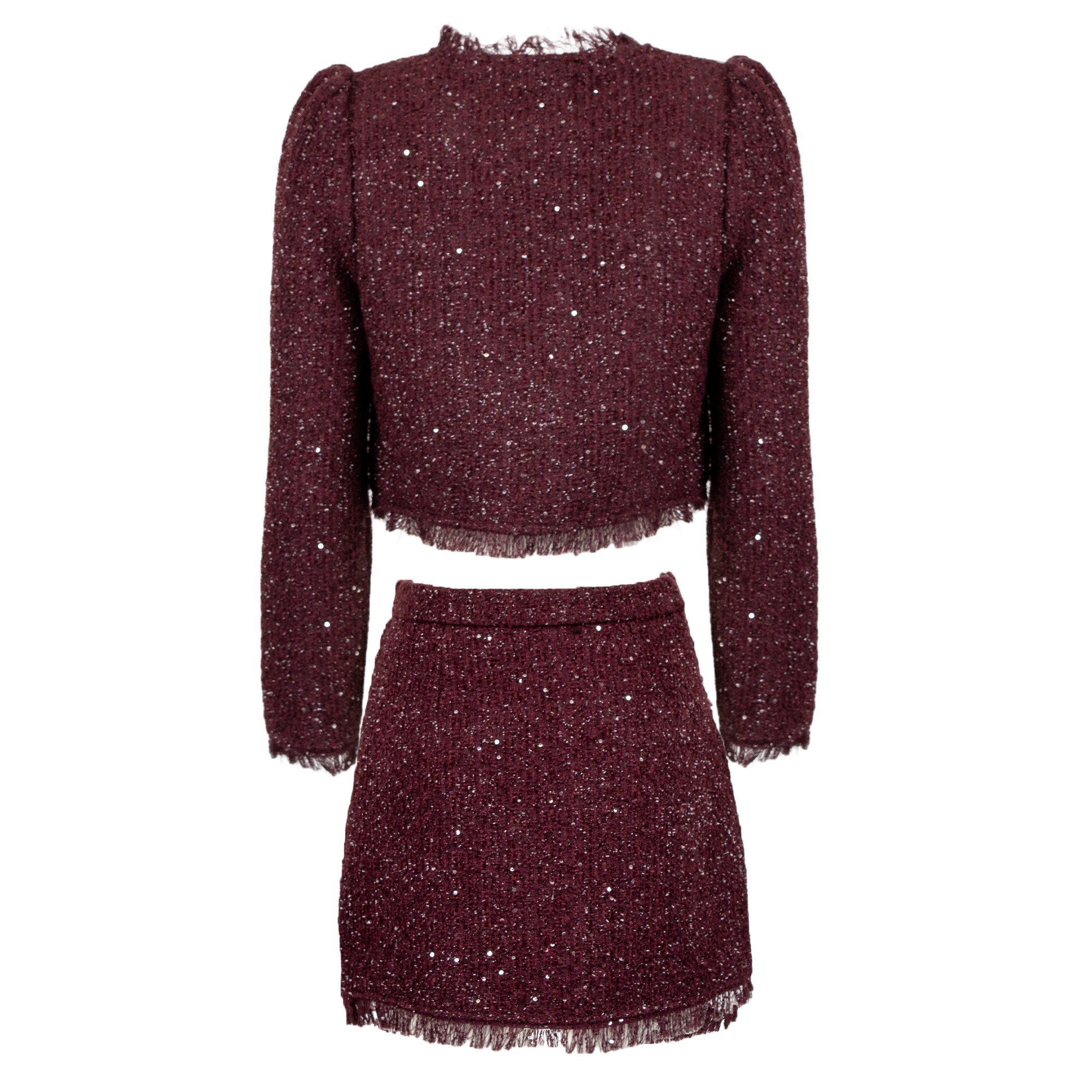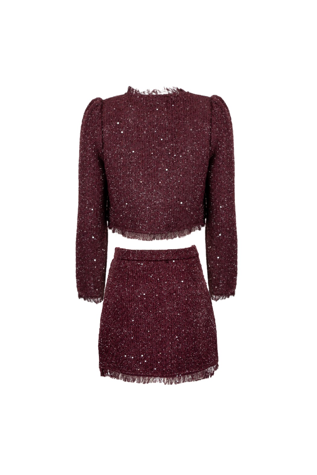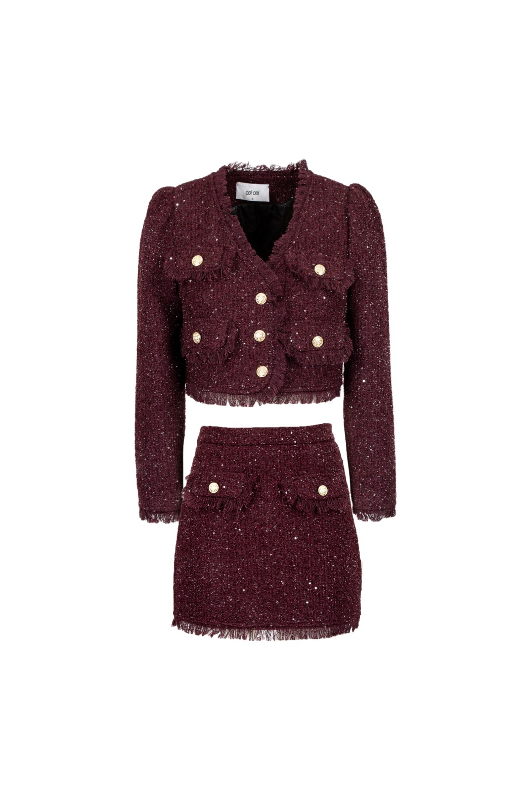 Set composto da giacca cropped e minigonna. Chiusura a doppiopetto con bottoni dorati. Scollo a V. Dettagli di orli sfrangiati. Maniche leggermente a sbuffo. Minigonna a trapezio. Tasche frontali applicate con bottone dorato e orli sfrangiati. Tweed con fili luminosi integrati.