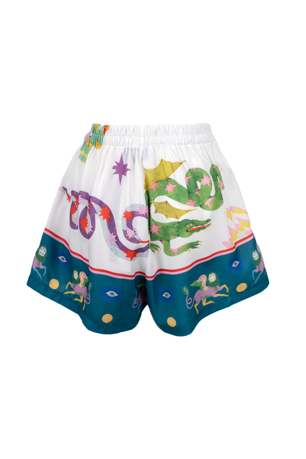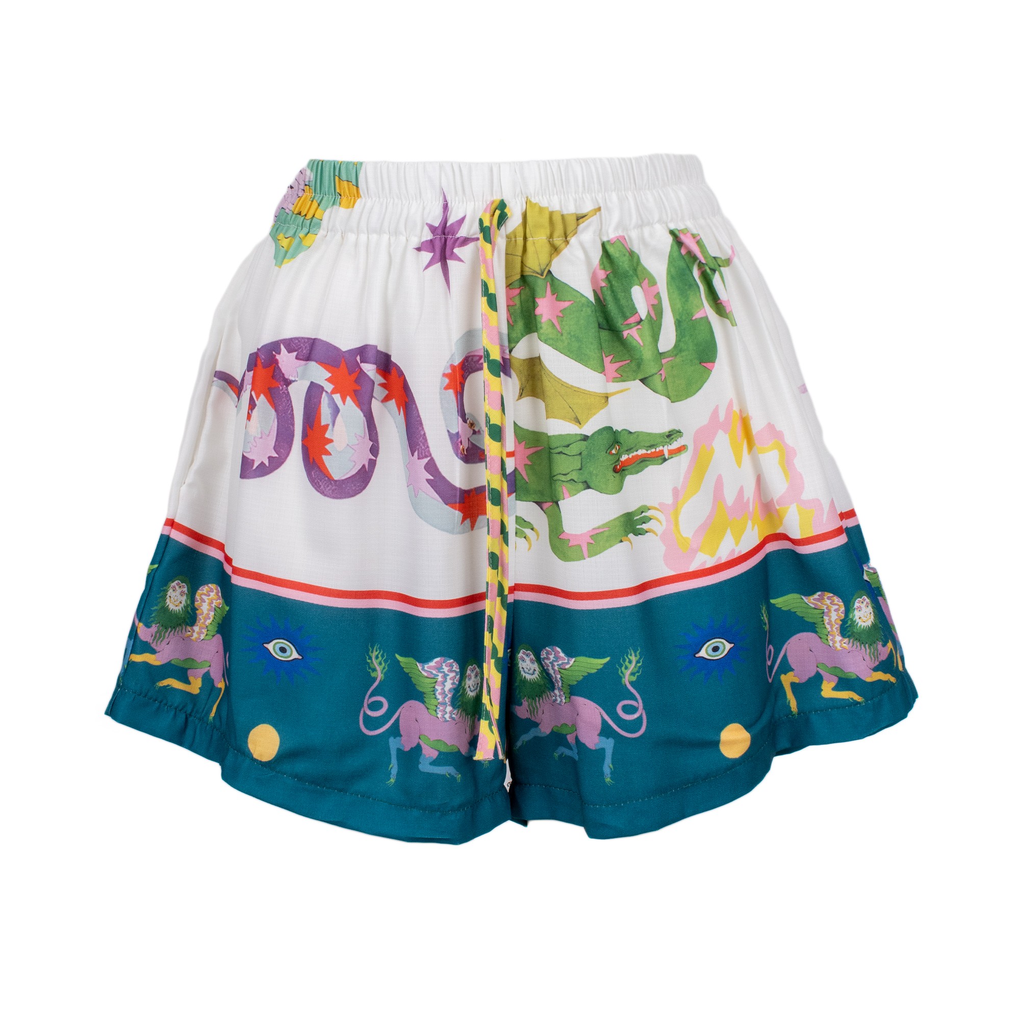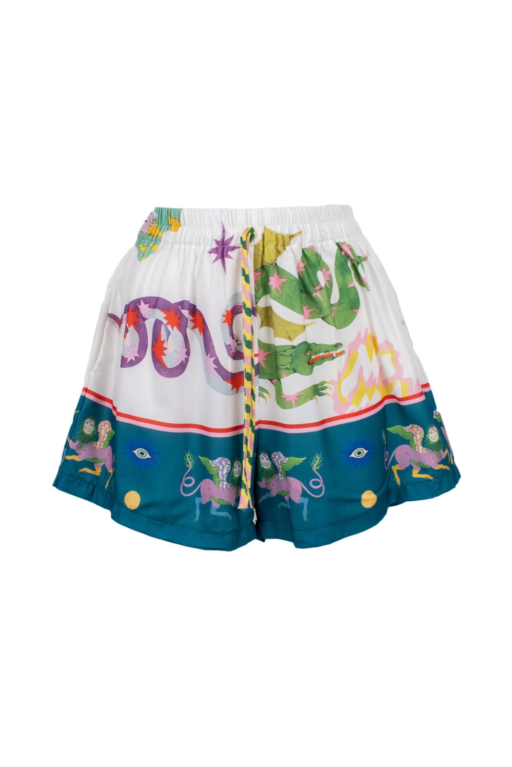 Shorts caramella fantasia con elastico e coulisse in vita.