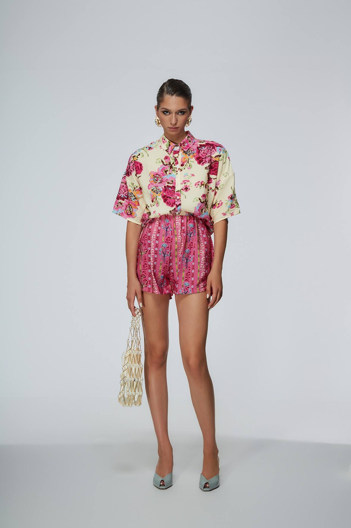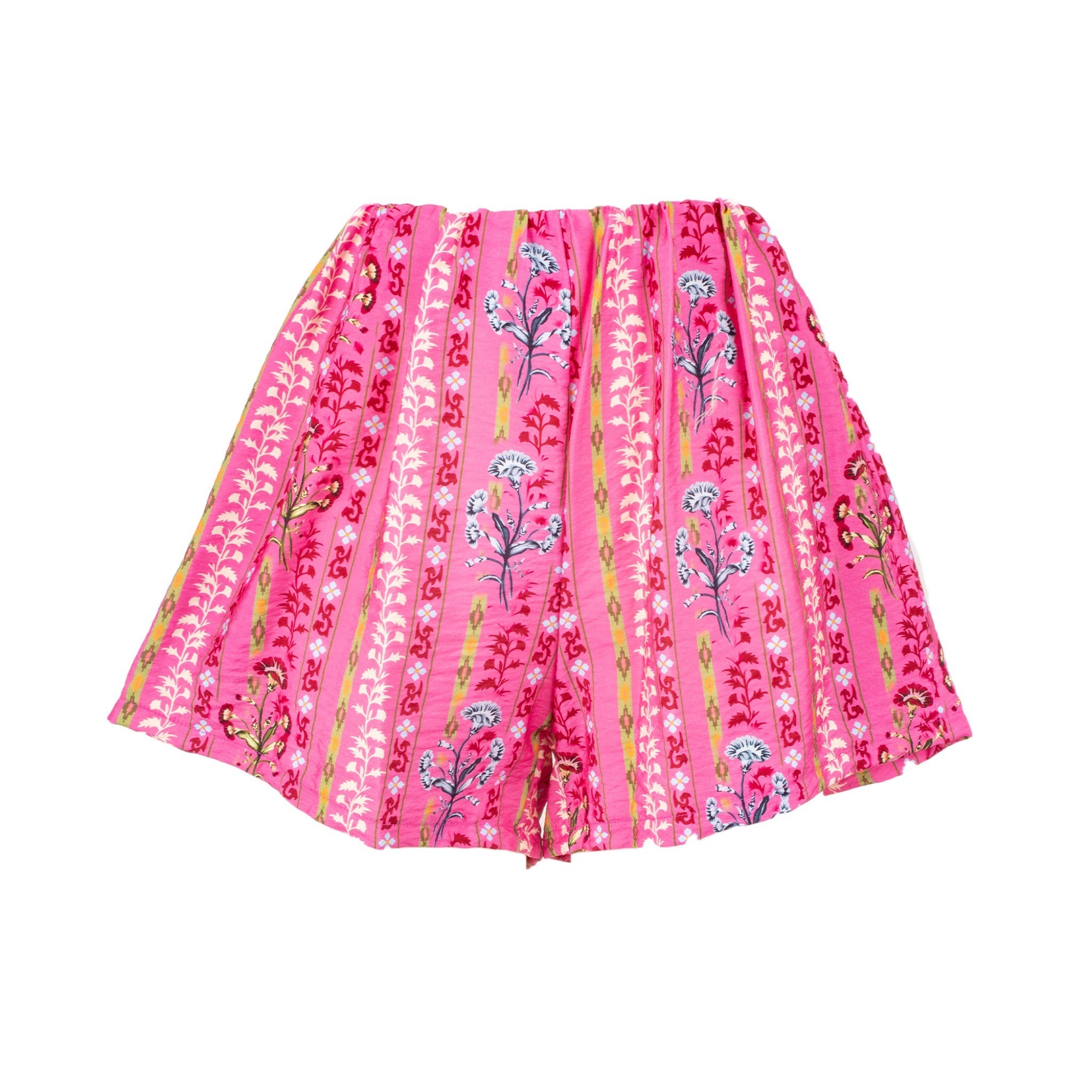 Shorts donna rosa con stampa fantasia, shorts estivi donna leggeri e fluidi, perfetti per look casual chic, outfit vacanza e abbinamenti primavera estate. Questo pantaloncino donna a vita alta con vestibilità ampia si distingue per la fantasia decorativa a righe verticali e motivi floreali, ideale per creare un look femminile, fresco e di tendenza. Comodi e versatili, questi shorts eleganti donna sono perfetti da indossare con camicie, top e bluse leggere per outfit estivi raffinati e contemporanei.