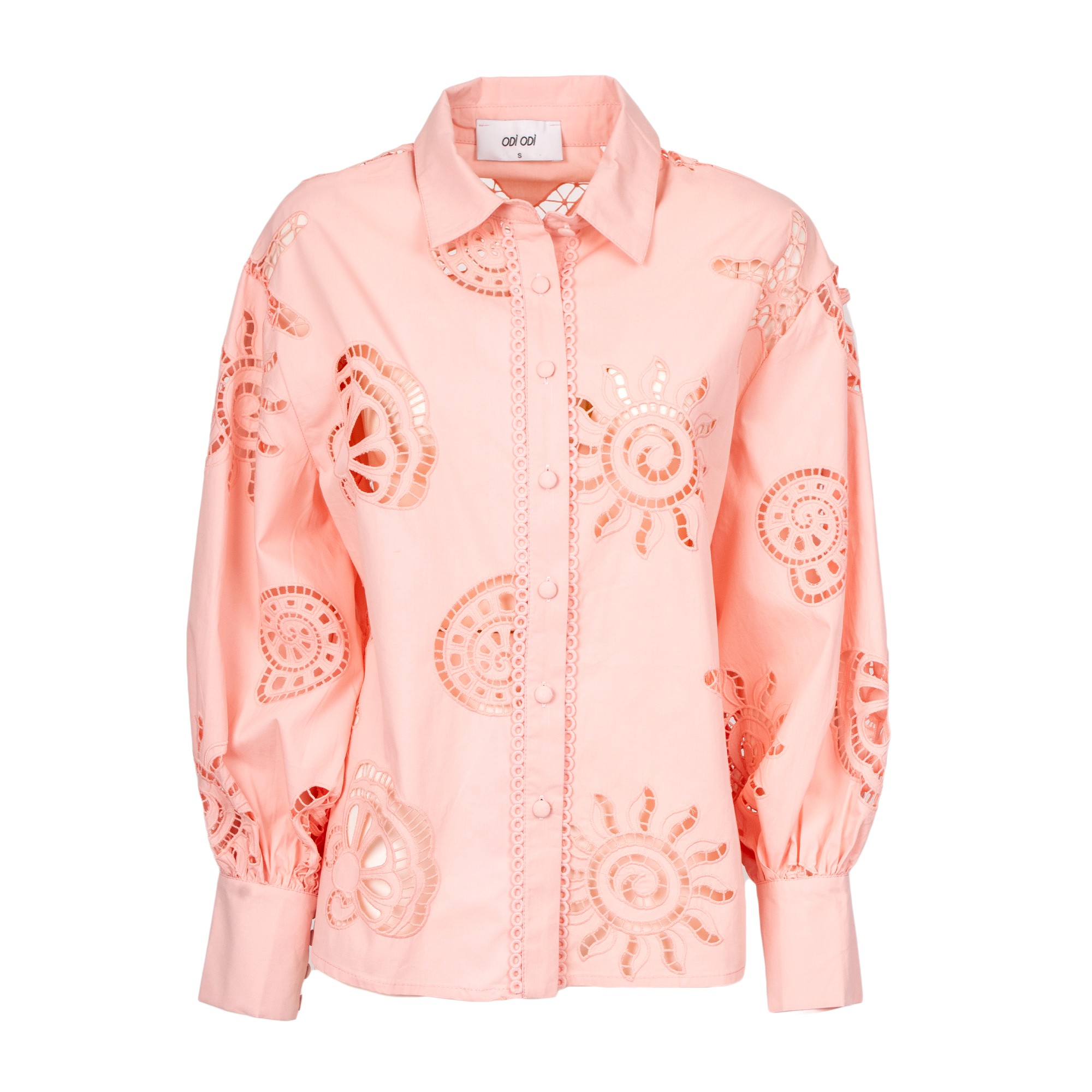 Camicia da donna rosa chiaro con ricami decorativi, elegante e femminile, perfetta per look estivi raffinati e outfit casual chic di tendenza. Questo modello si distingue per il colletto classico, l’ampio scollo con apertura frontale e le maniche lunghe dal volume morbido, dettagli che valorizzano la silhouette con uno stile sofisticato e contemporaneo. I ricami traforati decorativi donano al capo un tocco ricercato e luminoso, rendendolo ideale per chi cerca una camicia elegante da donna dal forte impatto visivo.
