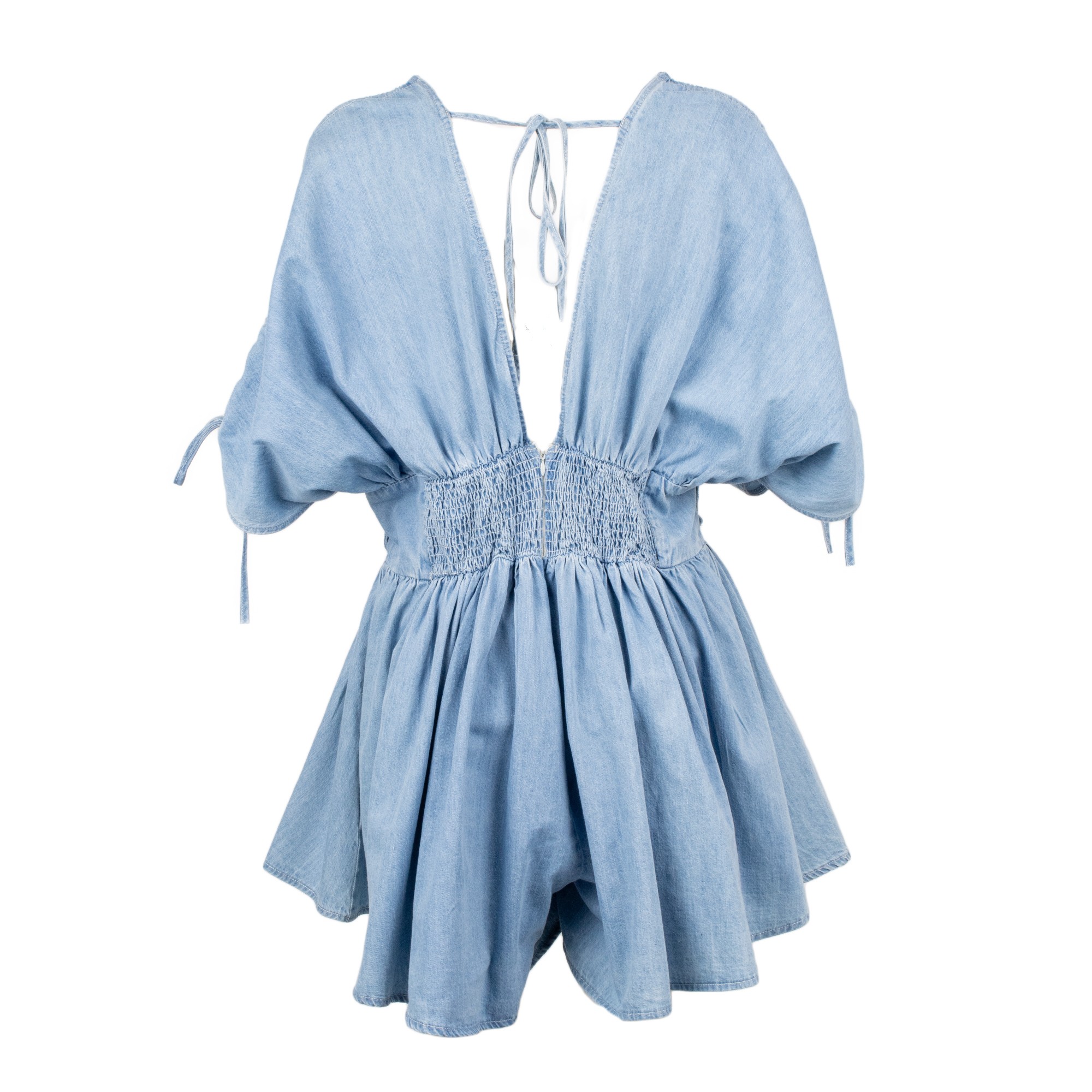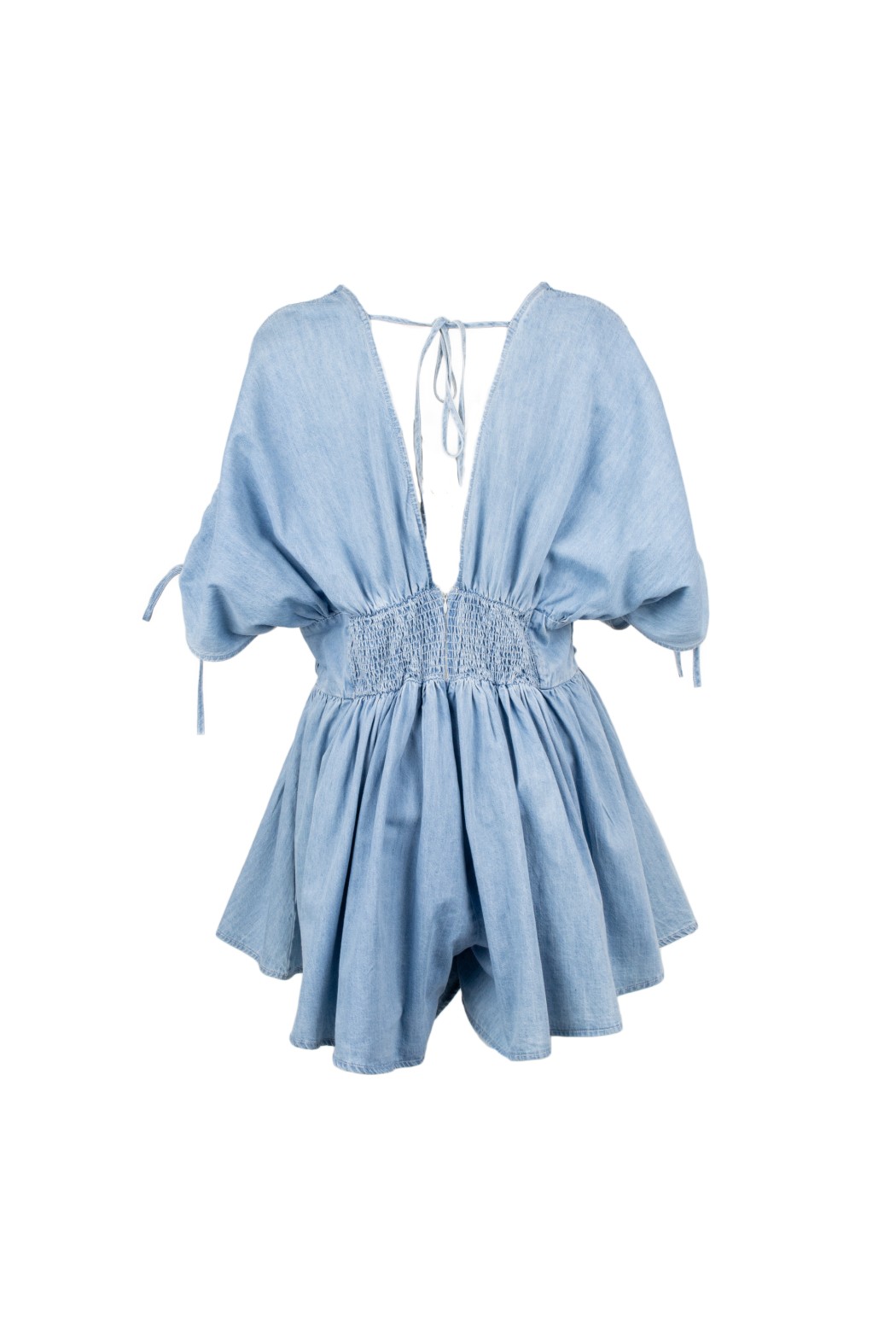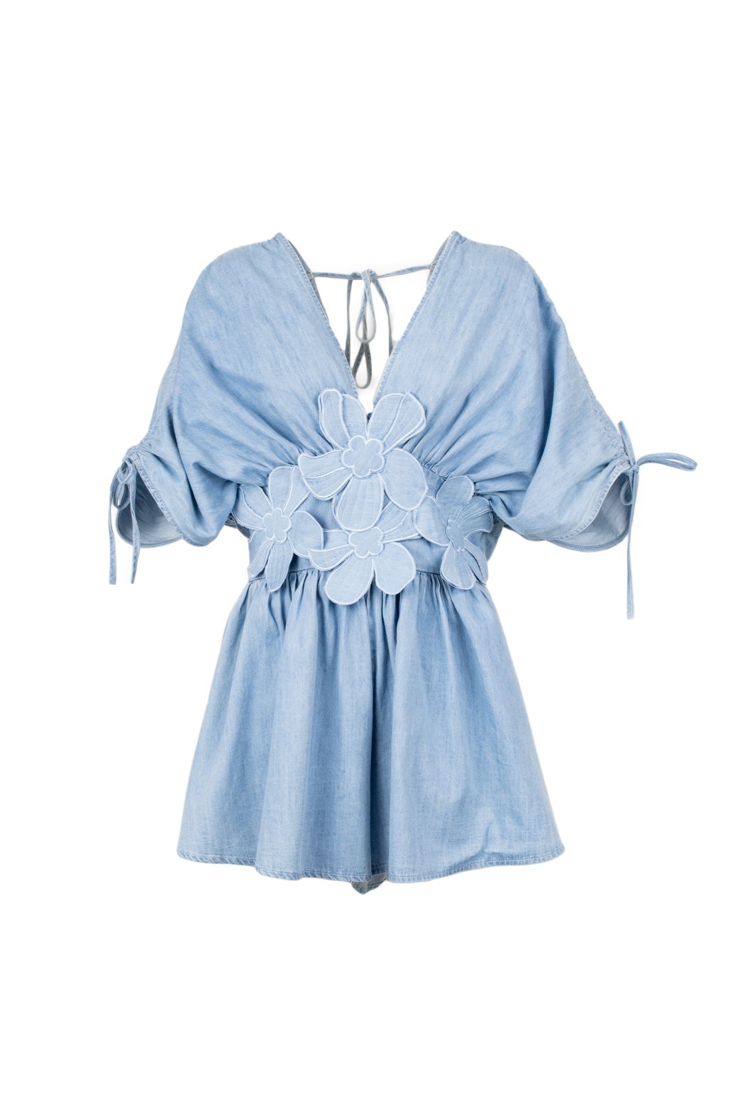 Abito corto in denim azzurro da donna, fresca e femminile, perfetta per look estivi originali e outfit casual chic dal gusto contemporaneo. Questo jumpsuit corto donna si distingue per il design in denim leggero, la linea morbida e fluida e i dettagli floreali applicati sul busto che aggiungono un tocco romantico e ricercato. Lo scollo profondo e le maniche ampie con laccetti donano movimento e carattere al capo, mentre la silhouette valorizza la figura con leggerezza e stile.