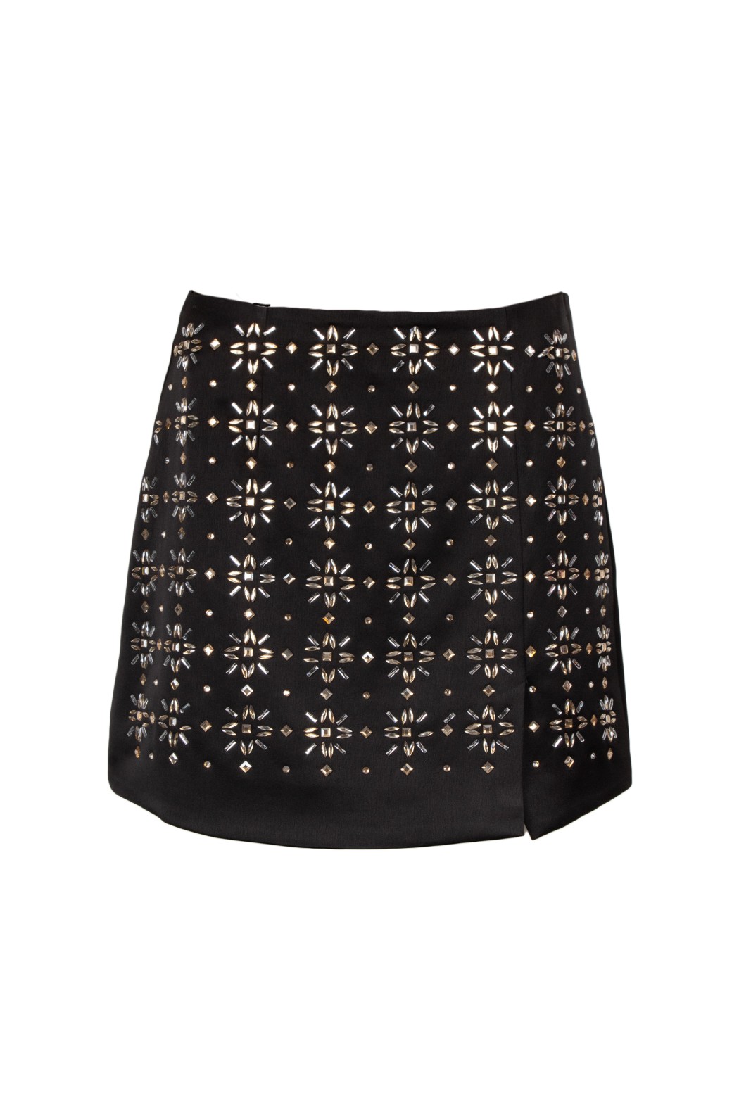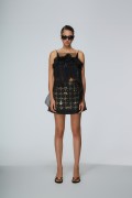 Perfetta da indossare con top eleganti, bluse leggere o camicie ricercate, questa gonna corta da sera è pensata per creare outfit moderni, femminili e curati nei dettagli. Il colore nero la rende versatile e sofisticata, mentre le applicazioni luminose aggiungono carattere e stile, trasformandola in un capo distintivo per la stagione primavera estate e per eventi esclusivi.