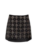 Gonna corta nera da donna con dettagli luminosi e linea aderente, perfetta per look eleganti, glamour e outfit da sera di tendenza.