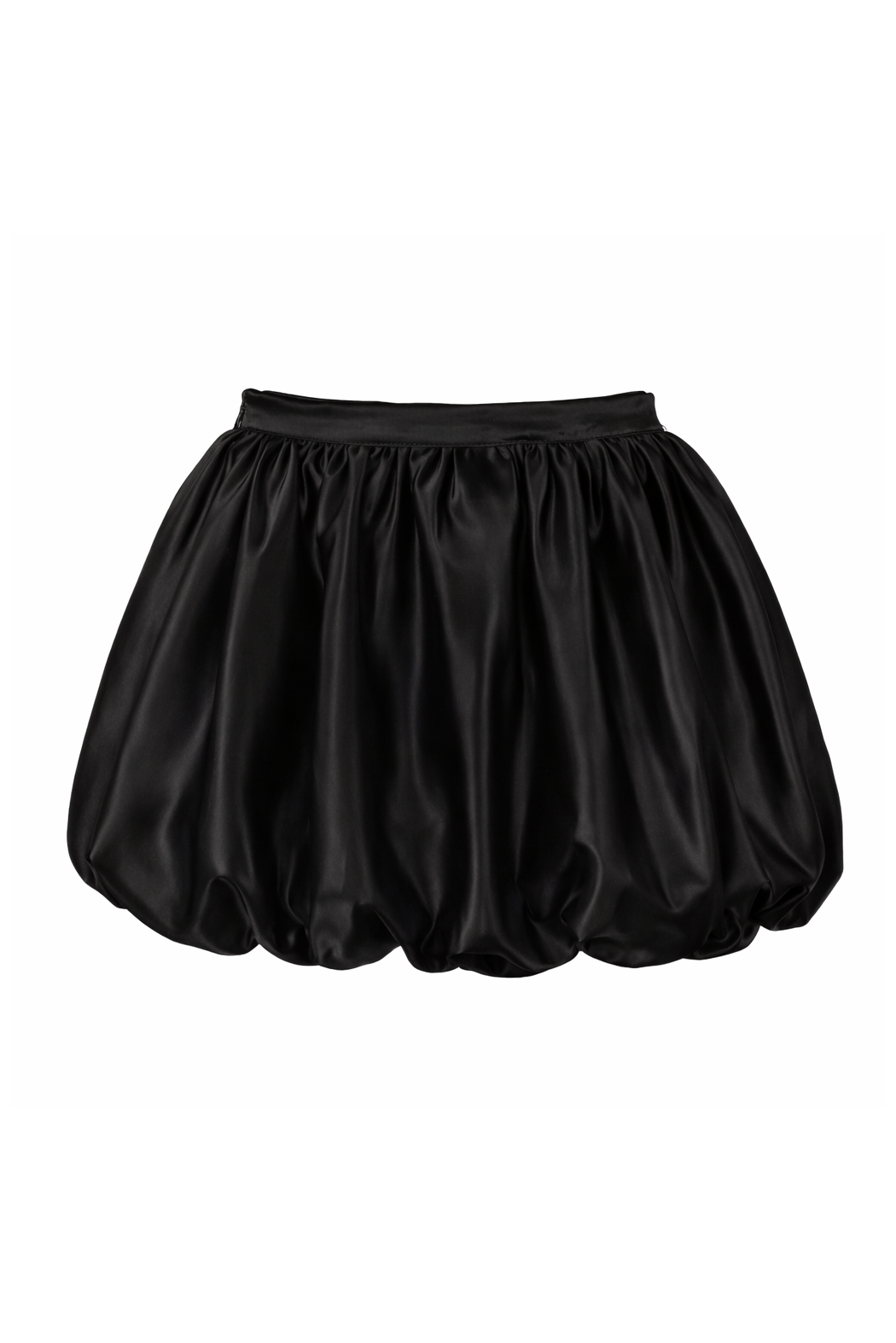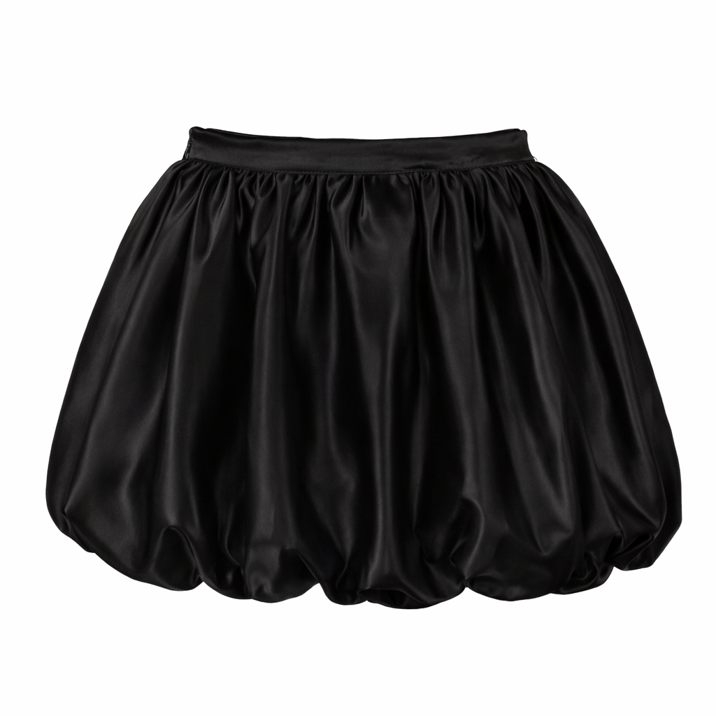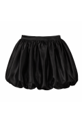 Gonna corta nera in satin con silhouette balloon, caratterizzata da volume morbido e linea ampia. Un modello elegante e contemporaneo, perfetto per look femminili, da sera o per occasioni speciali.