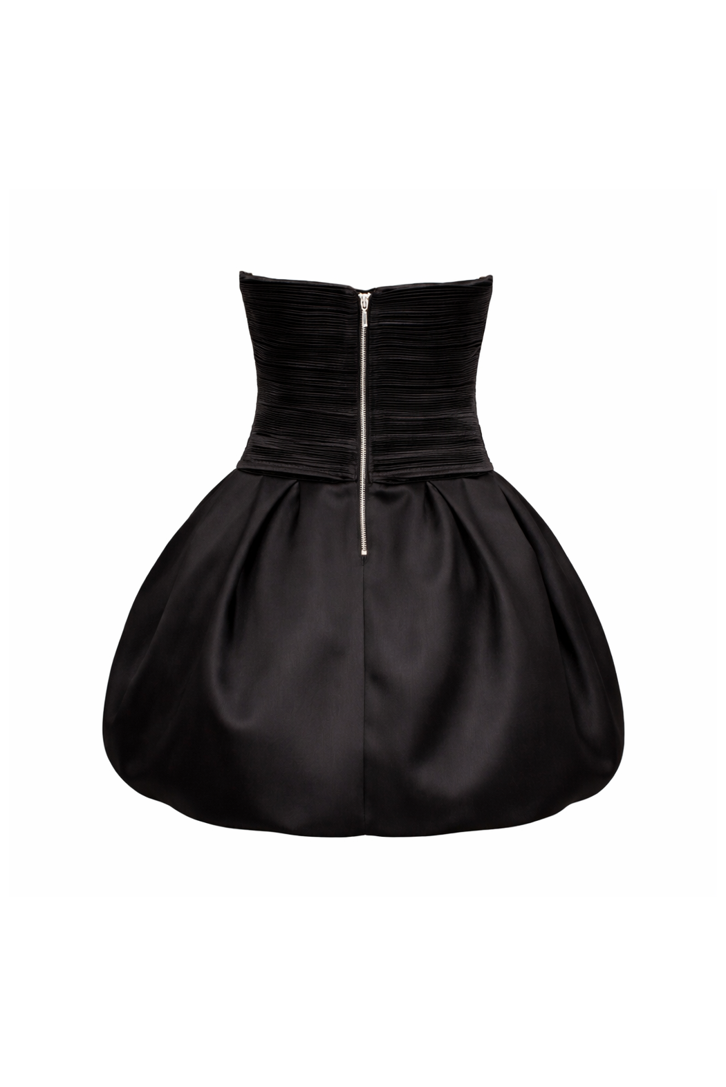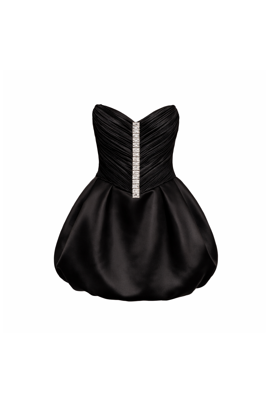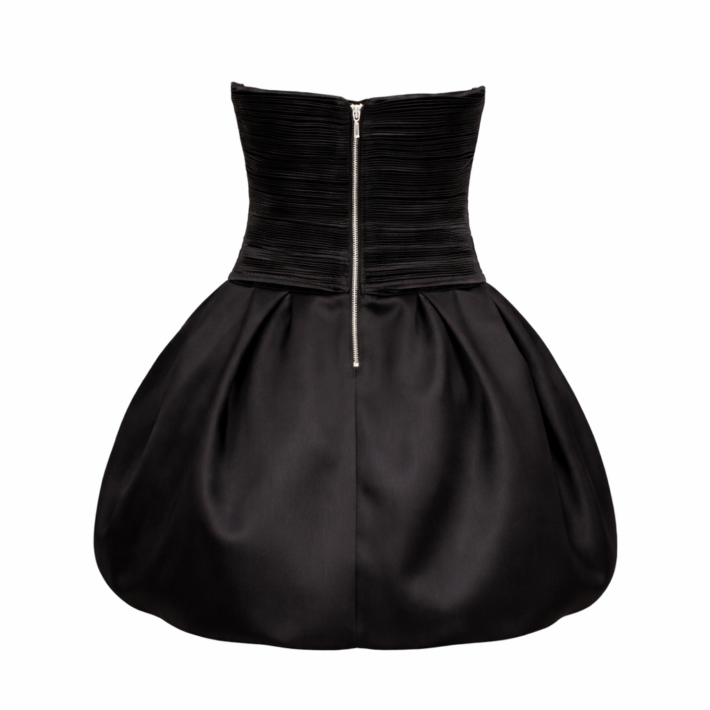 Abito corto nero dal design elegante e strutturato, con corpetto plissé a cuore impreziosito da dettaglio gioiello centrale e gonna balloon voluminosa. Un modello sofisticato e scenografico, perfetto per cerimonie, party ed occasioni speciali.