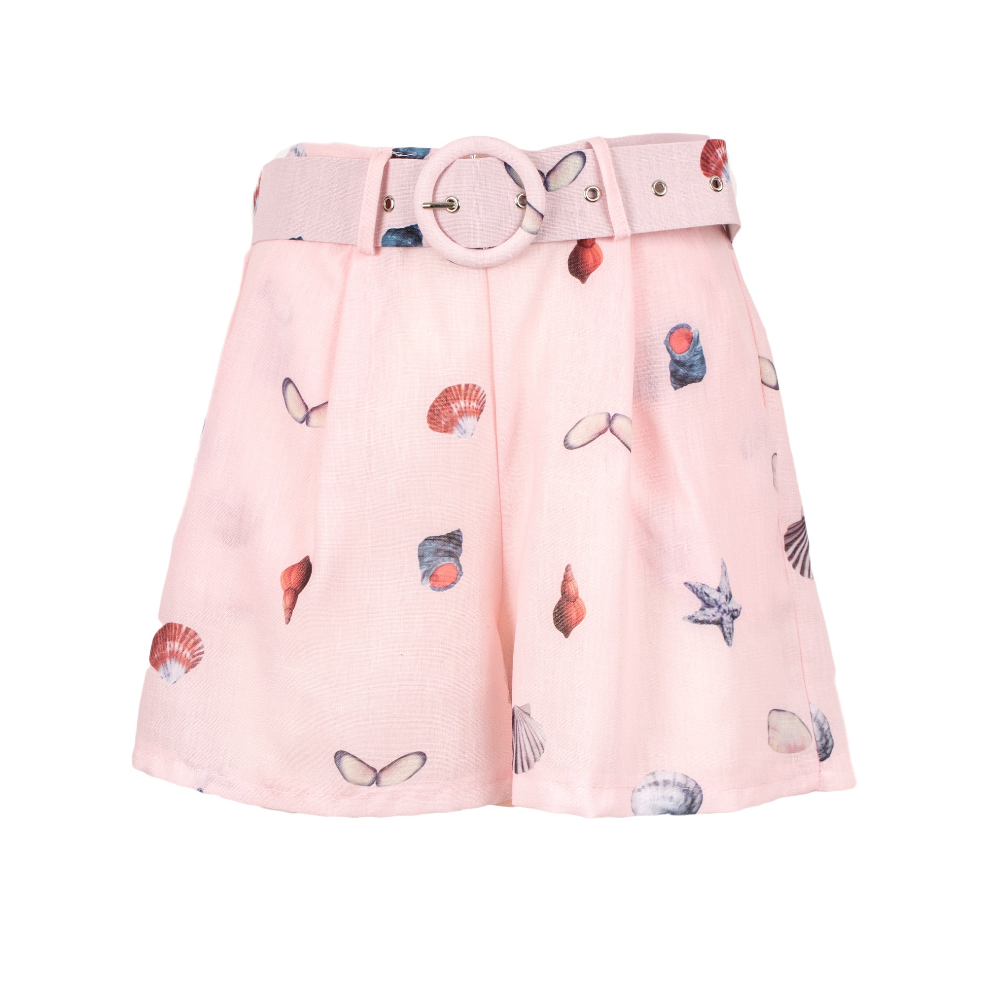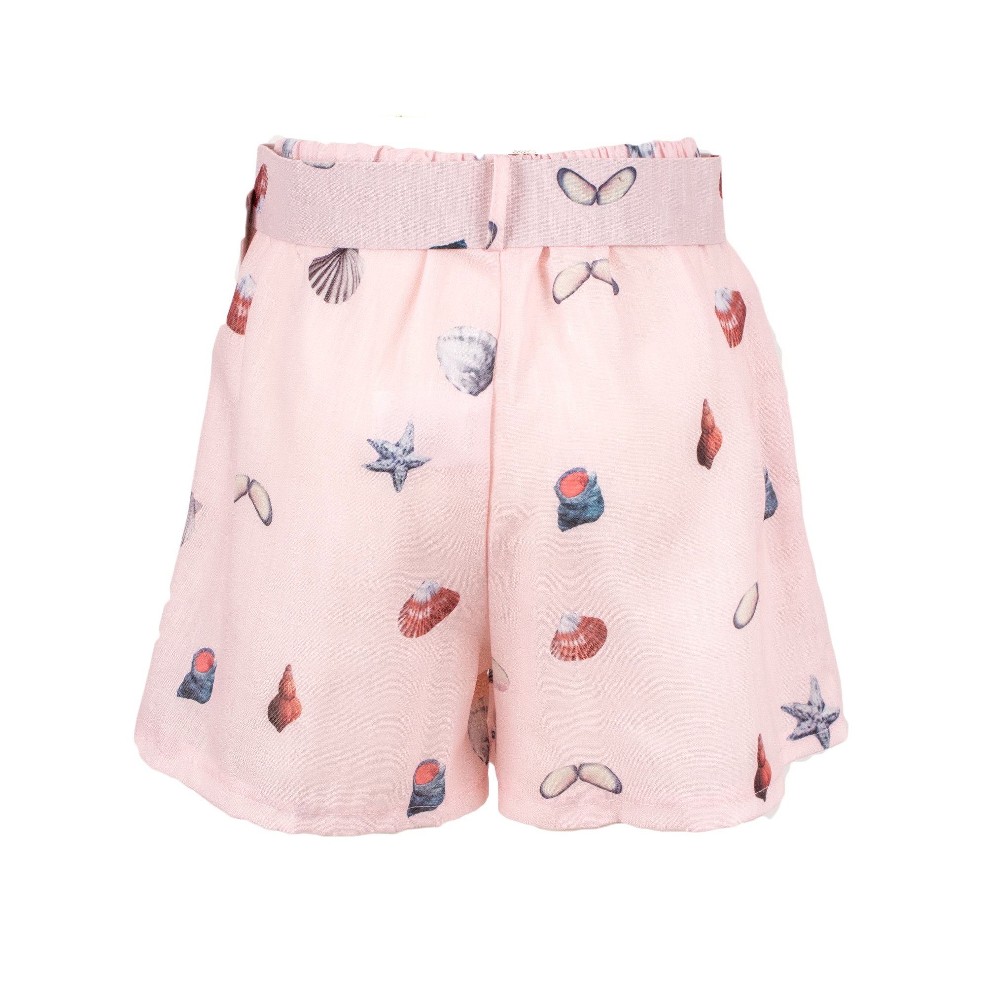Shorts donna con stampa marina dal design fresco, leggero e contemporaneo, perfetti per completare il guardaroba estivo con un tocco femminile e ricercato. Il modello si distingue per la silhouette morbida e fluida, che assicura comfort e libertà di movimento, e per la cintura coordinata in vita con fibbia tonda, dettaglio che valorizza la figura e aggiunge un accento elegante al look. La delicata stampa all over ispirata al mare, con conchiglie, stelle marine e piccoli motivi marini, dona originalità al capo e ne esalta lo stile raffinato e vacanziero. La nuance rosa cipria rende questi shorts eleganti donna perfetti da abbinare a camicie leggere, top essenziali o bluse coordinate per creare outfit chic, luminosi e di tendenza. Ideali per il tempo libero, le vacanze, i look da resort e le occasioni estive da giorno.