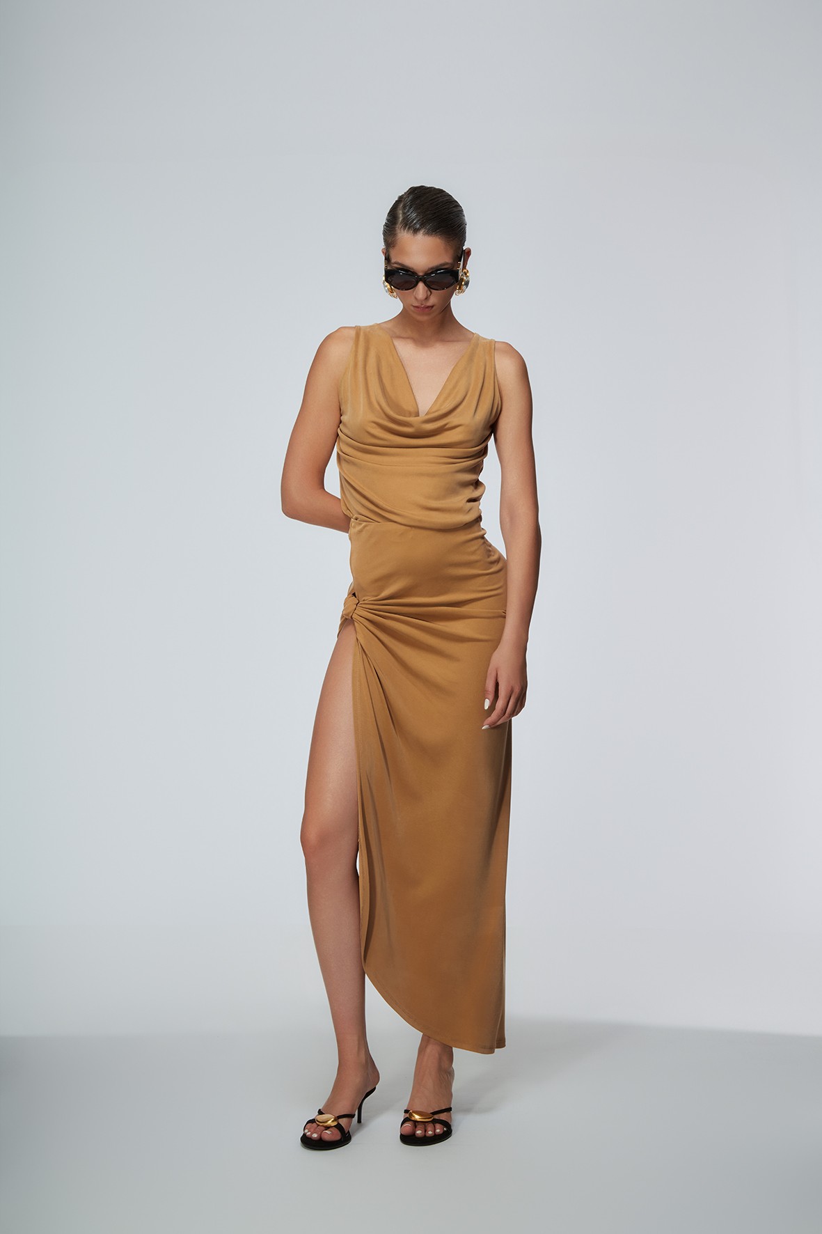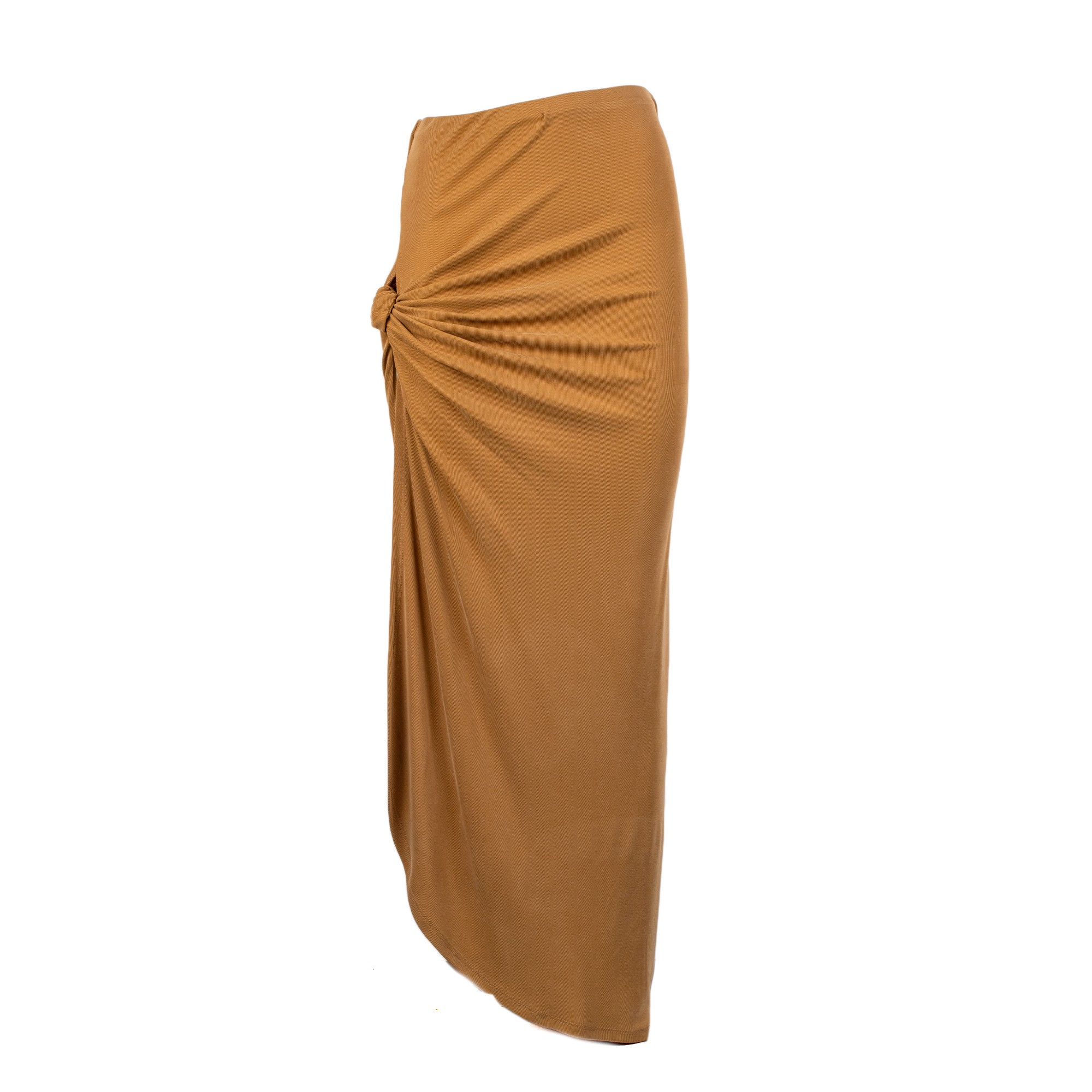 onna lunga elegante da donna dal design sofisticato e femminile, pensata per valorizzare la silhouette con una linea fluida e sensuale. Il modello si distingue per il drappeggio morbido che accompagna il corpo con naturale eleganza e per il raffinato dettaglio arricciato laterale, elemento che crea movimento e dona carattere al capo. Lo spacco profondoaggiunge un tocco deciso e contemporaneo, esaltando la femminilità con equilibrio e raffinatezza. Realizzata in una calda tonalità caramello/sabbia, questa gonna lunga con spacco è perfetta da abbinare a top drappeggiati, body aderenti o bluse eleganti per creare outfit chic e d’impatto. Ideale per serate speciali, eventi, cene eleganti, party e occasioni in cui desideri un look glamour e ricercato.