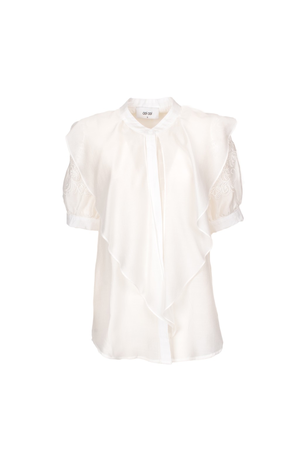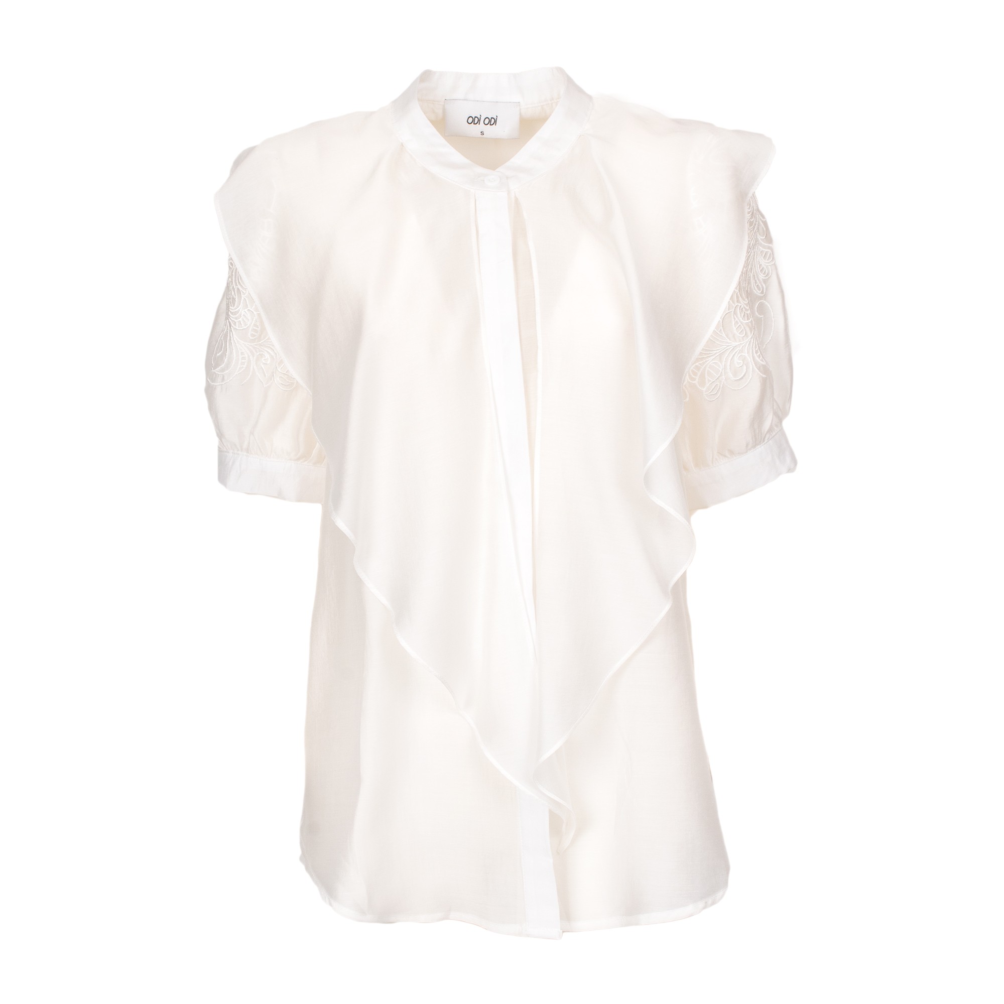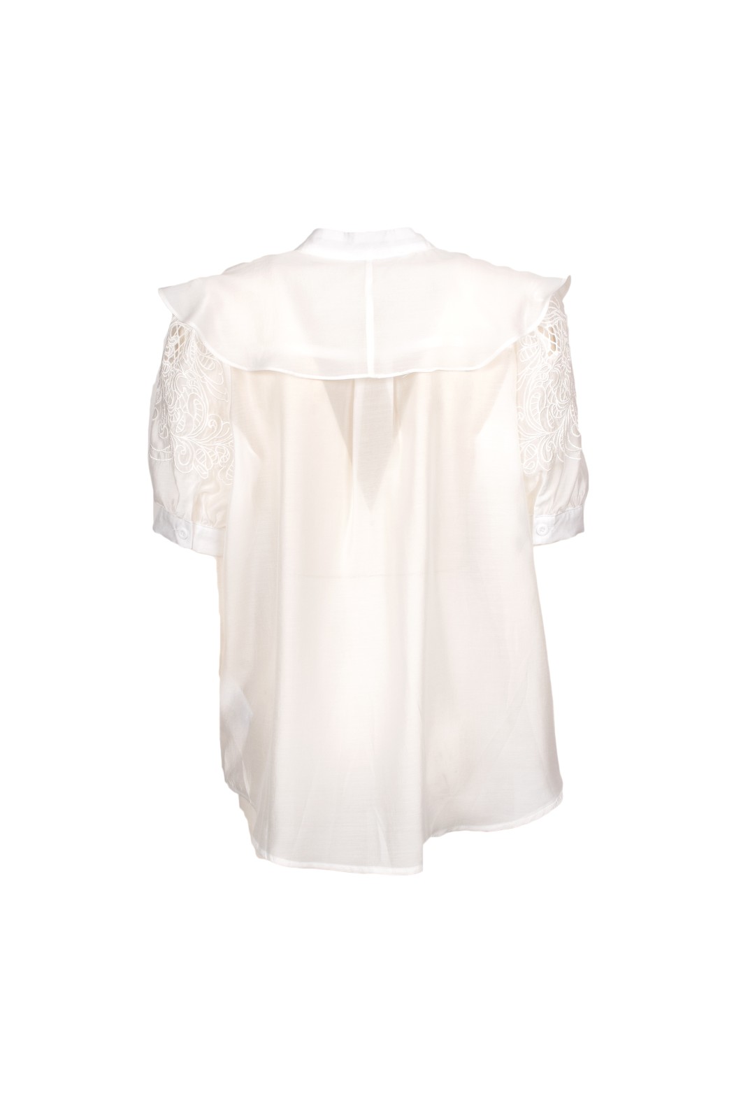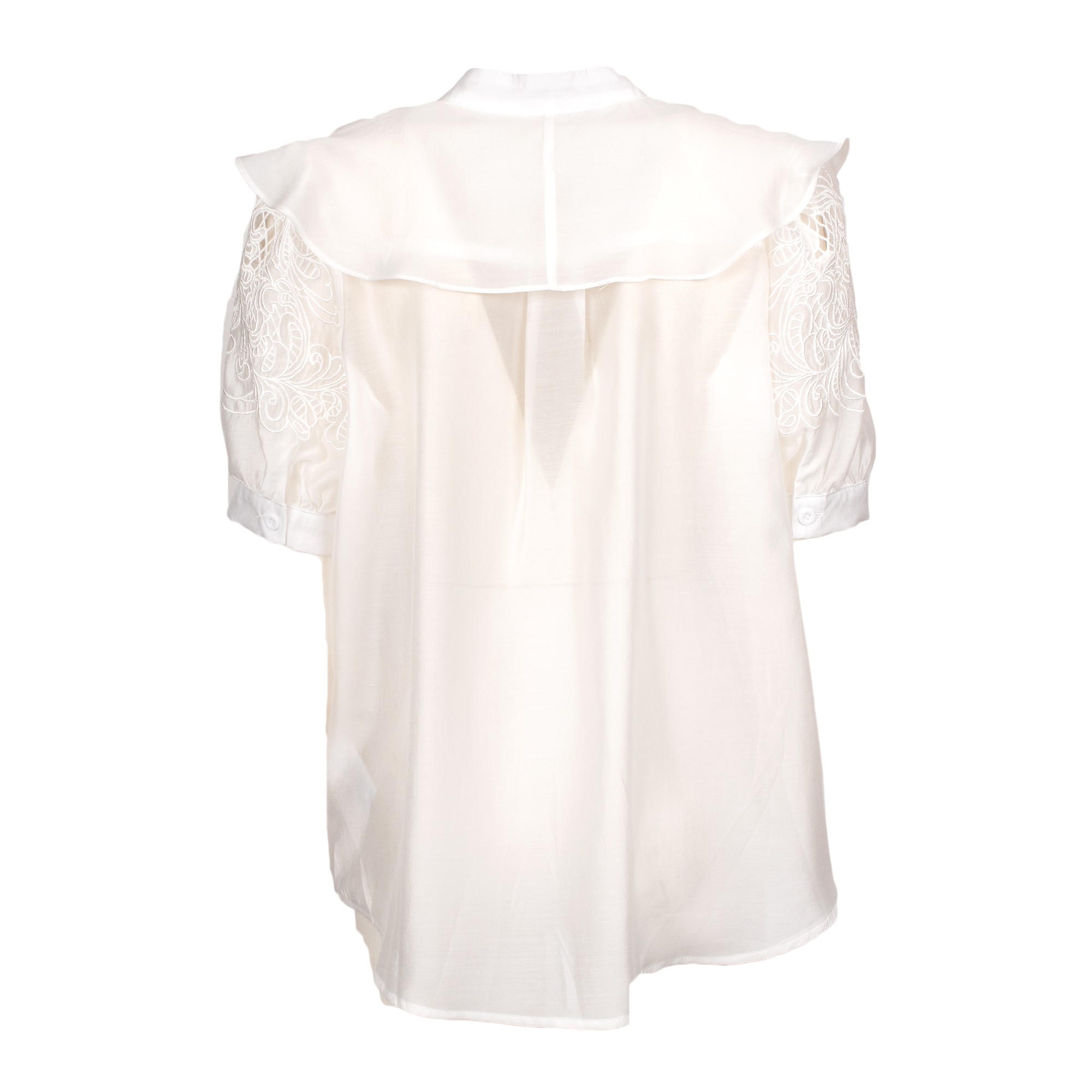 Camicia bianca dal design romantico e sofisticato, caratterizzata da linea fluida, mantellina con volant e maniche in pizzo ricamato che donano leggerezza e femminilità. Il collo alla coreana e la chiusura frontale nascosta completano il modello con un tocco elegante e ricercato. Perfetta per look raffinati, da giorno o per occasioni speciali.