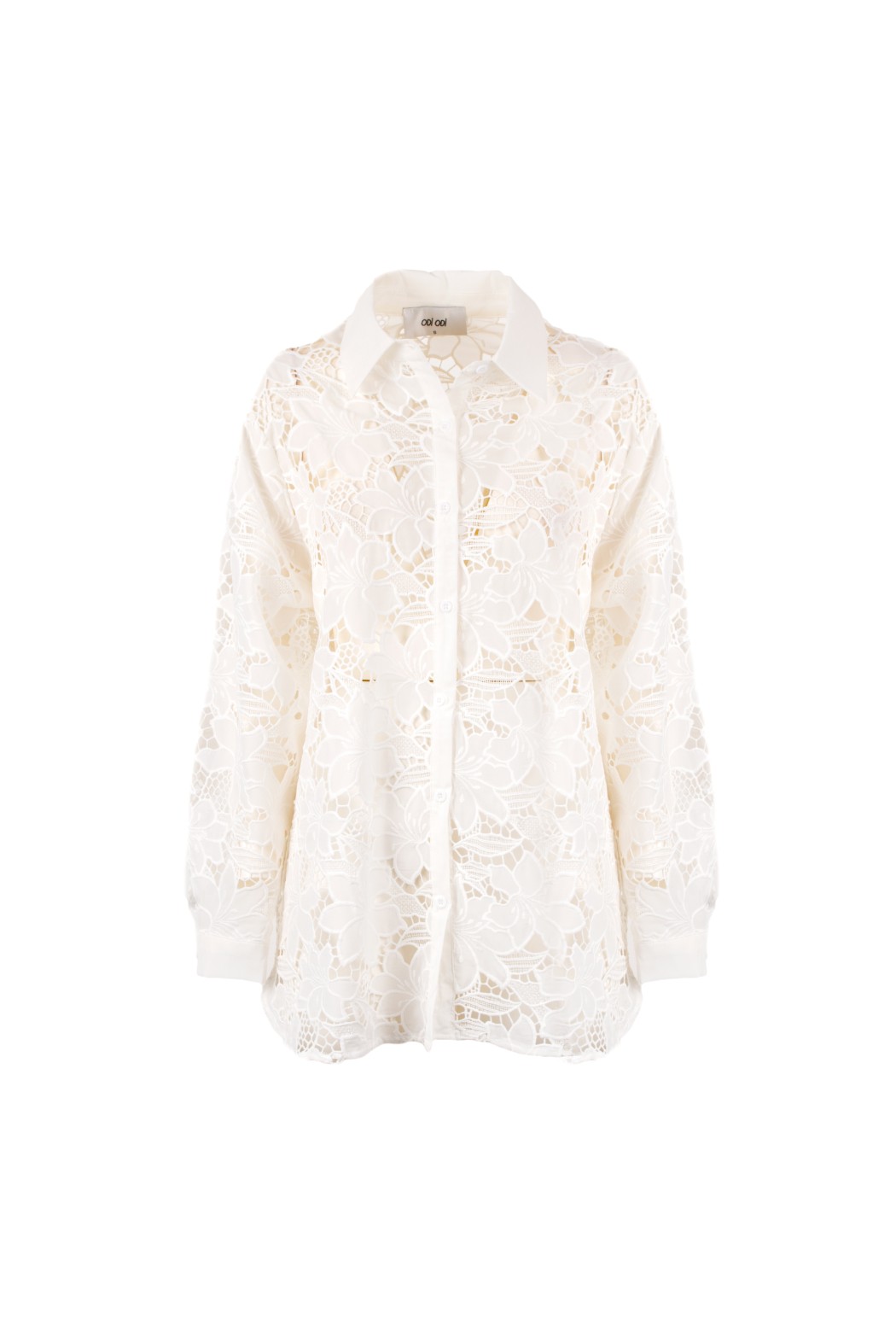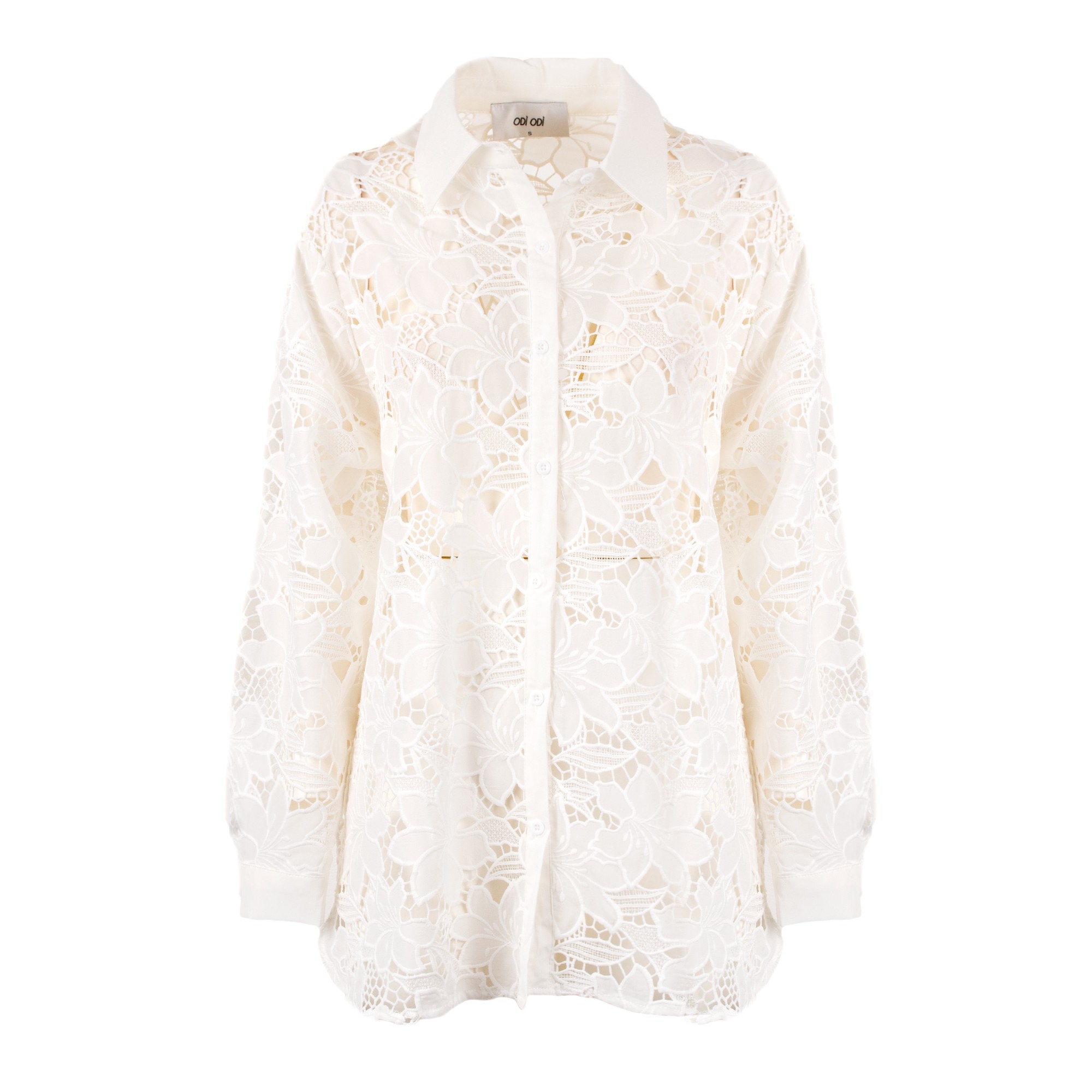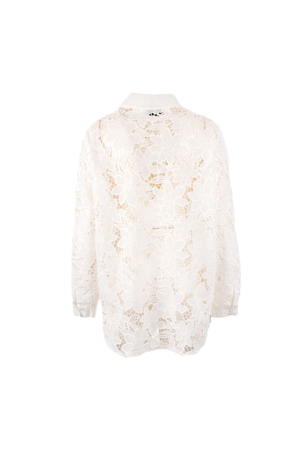 Camicia bianca dal fascino raffinato e femminile, realizzata in pizzo floreale con eleganti trasparenze che donano leggerezza al design. Il colletto classico, l’abbottonatura frontale e la linea fluida valorizzano il capo con uno stile sofisticato e contemporaneo. Perfetta per look chic da giorno, occasioni speciali e abbinamenti eleganti.