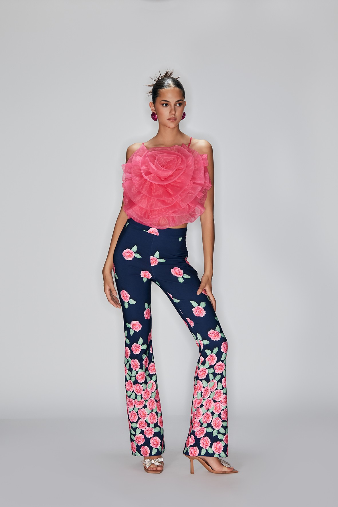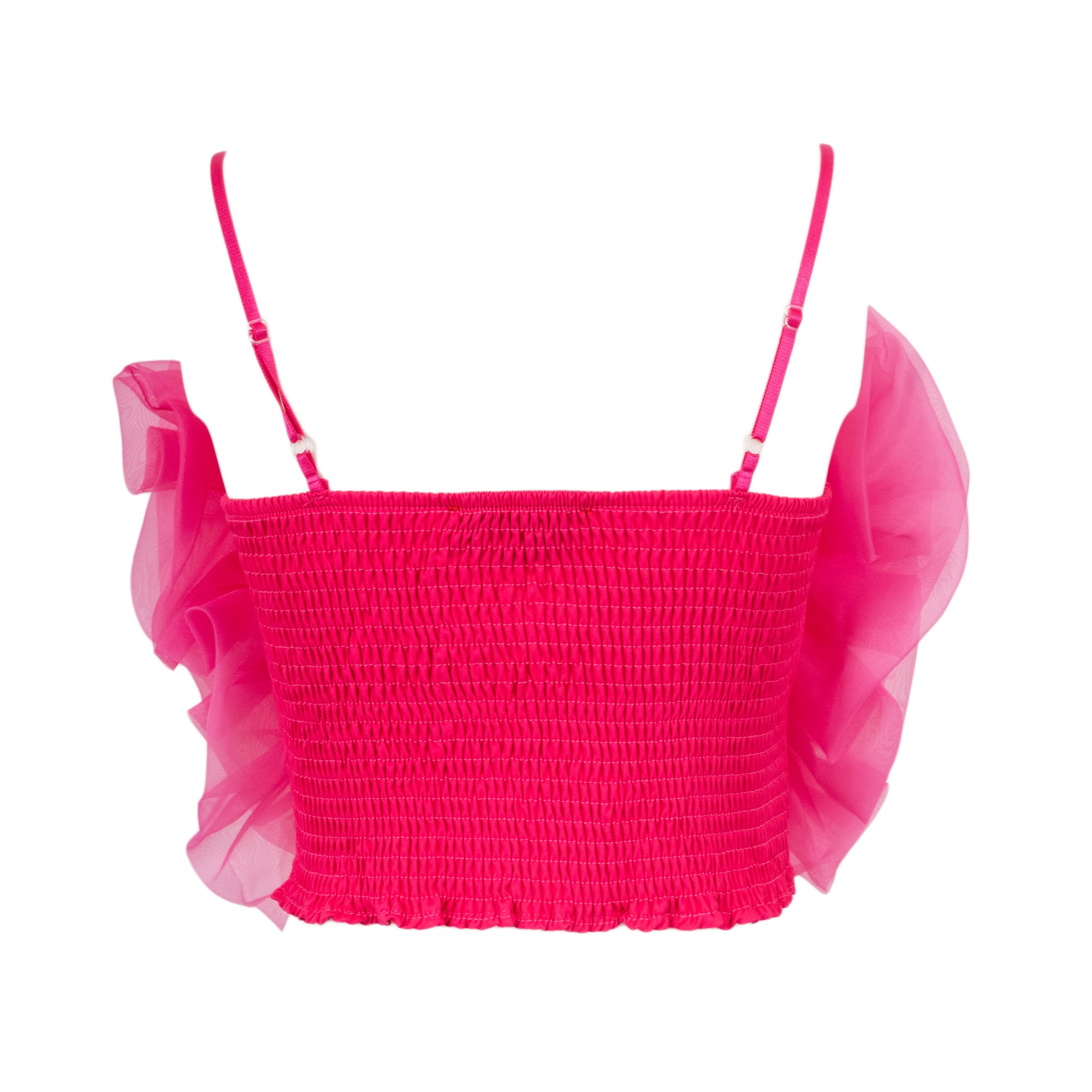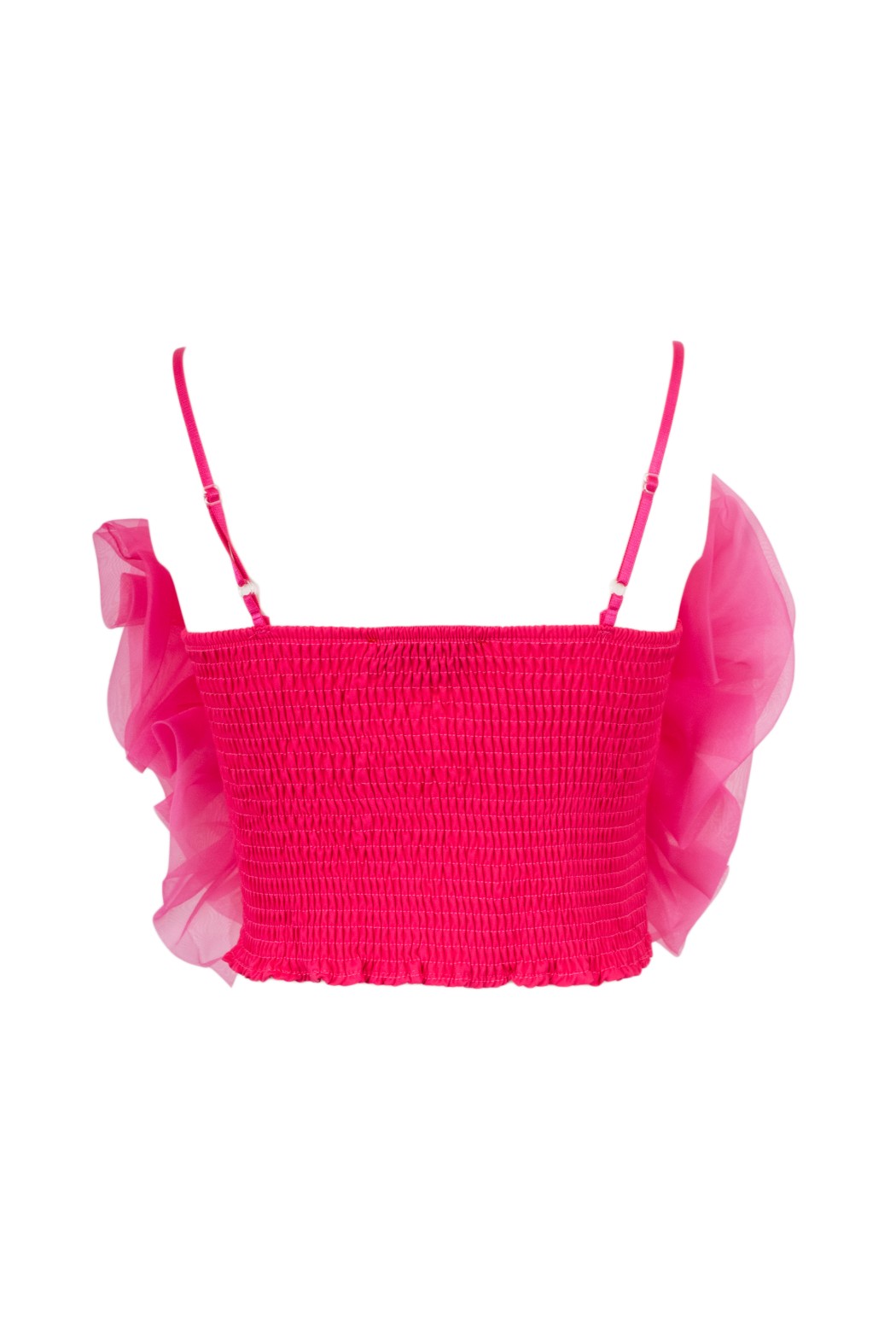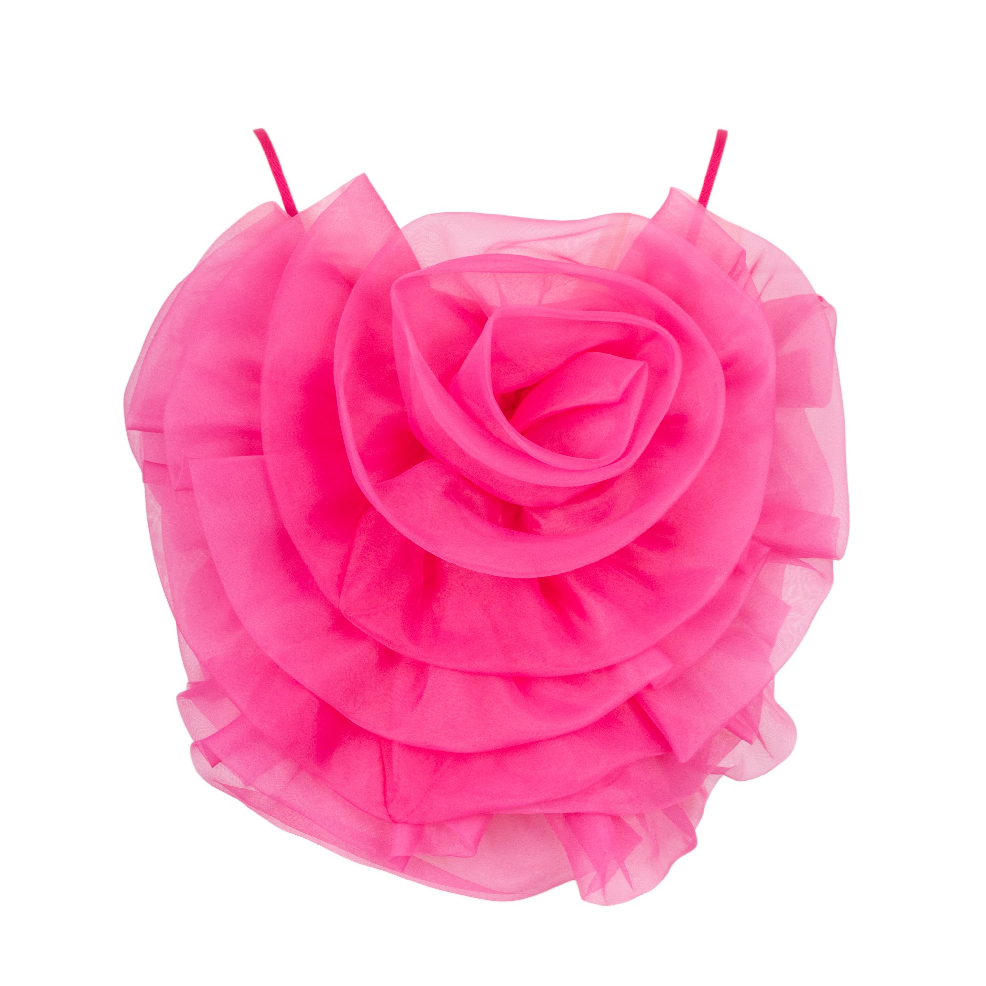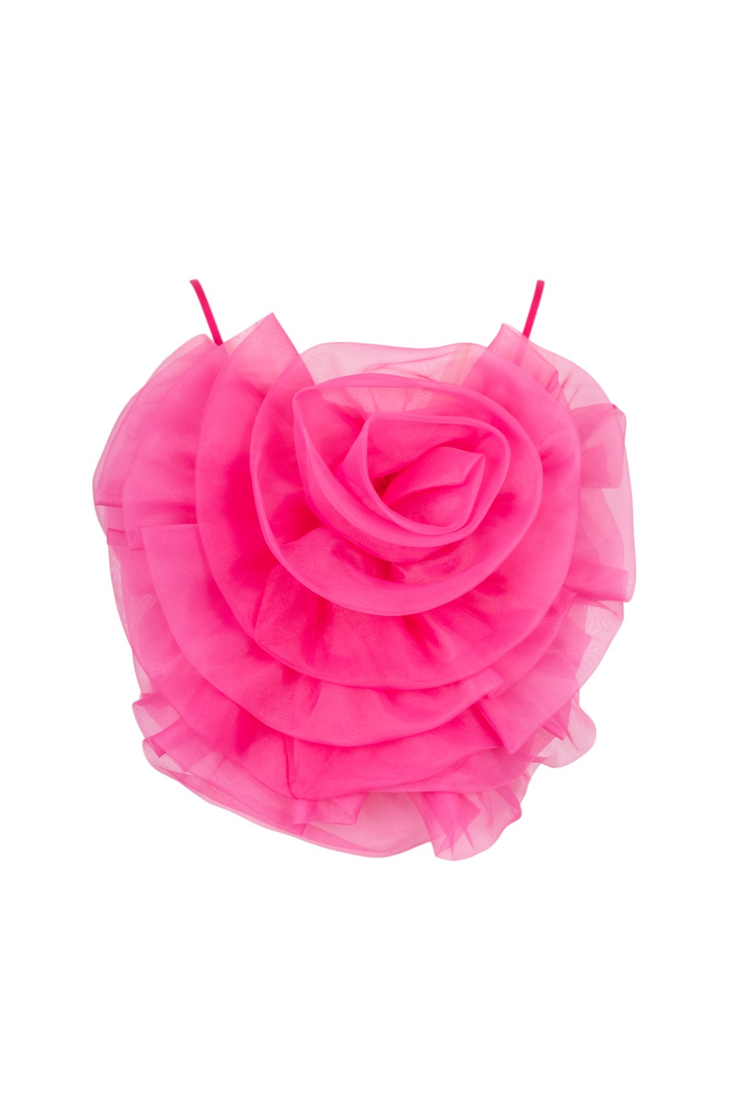 Top mini con grande fiore in tessuto sul fronte, bretelle.